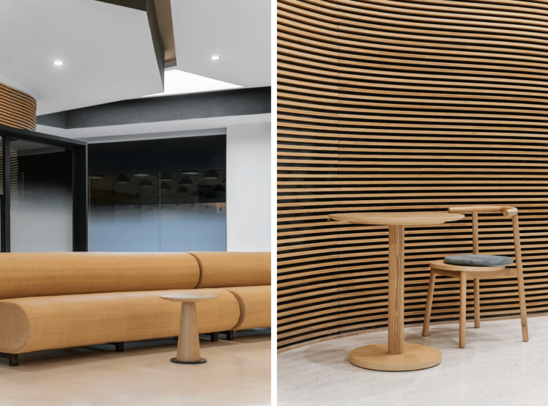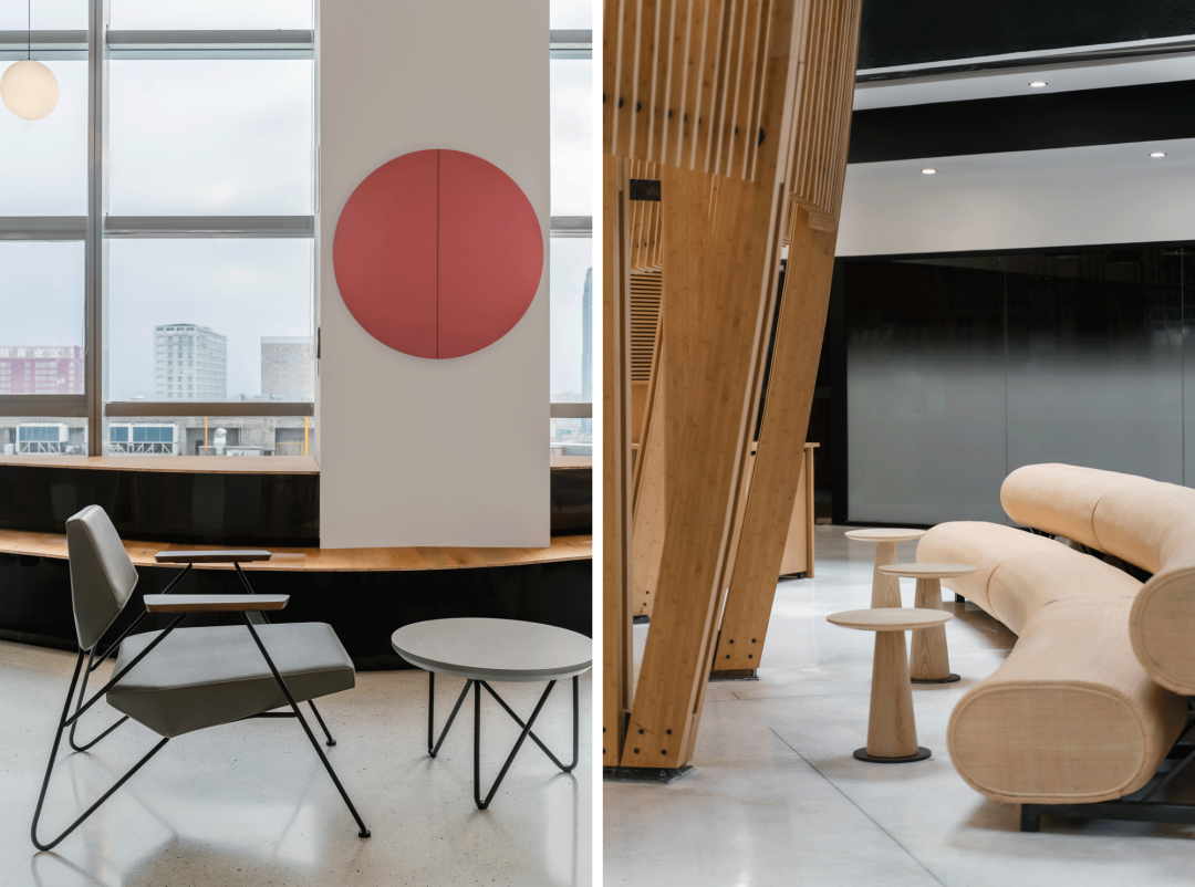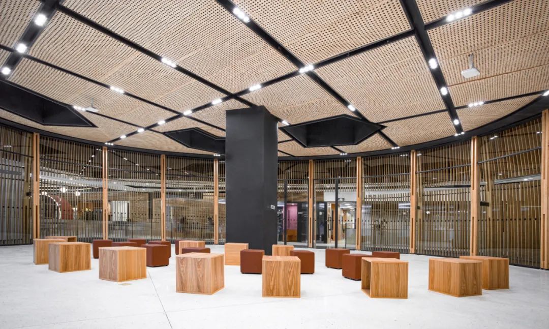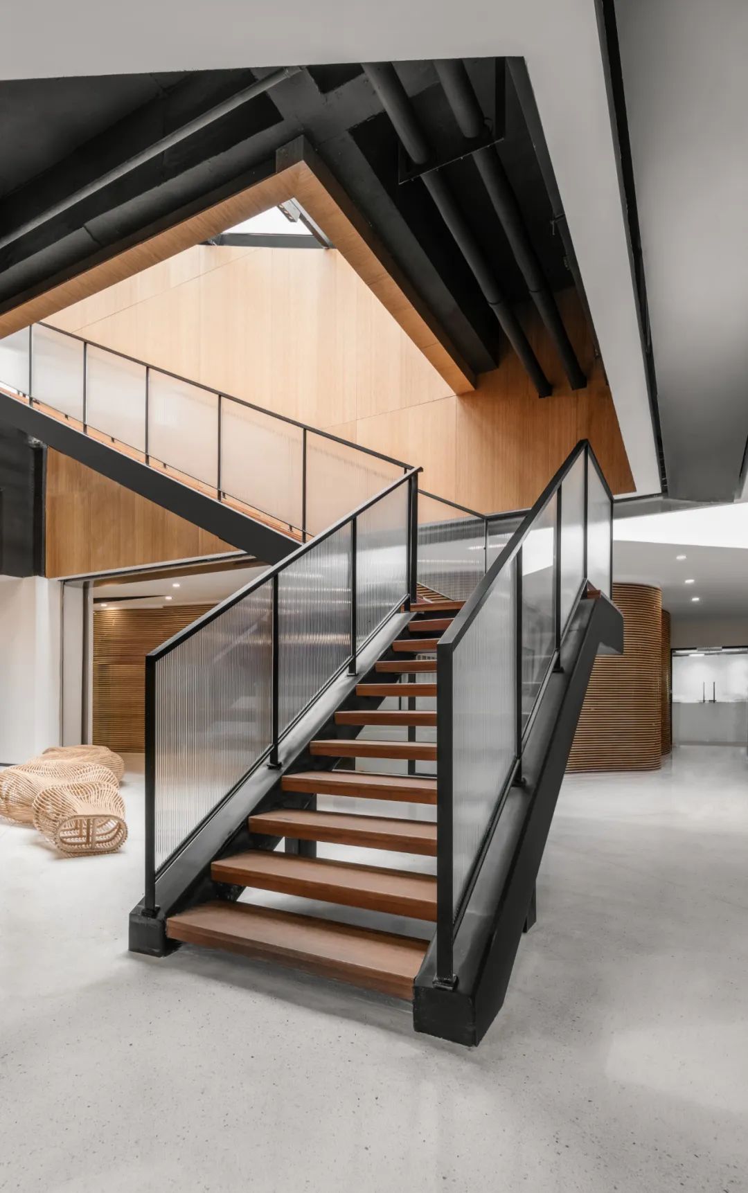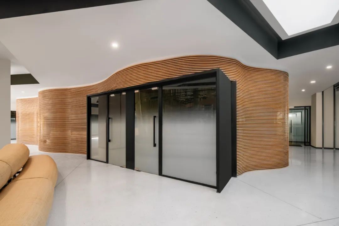 ▼办公区域中庭置入竹材结构,其他空间环绕布局,A woodenstructure is placed in the atrium of the office area, and other spaces aresurrounded by the layout.
