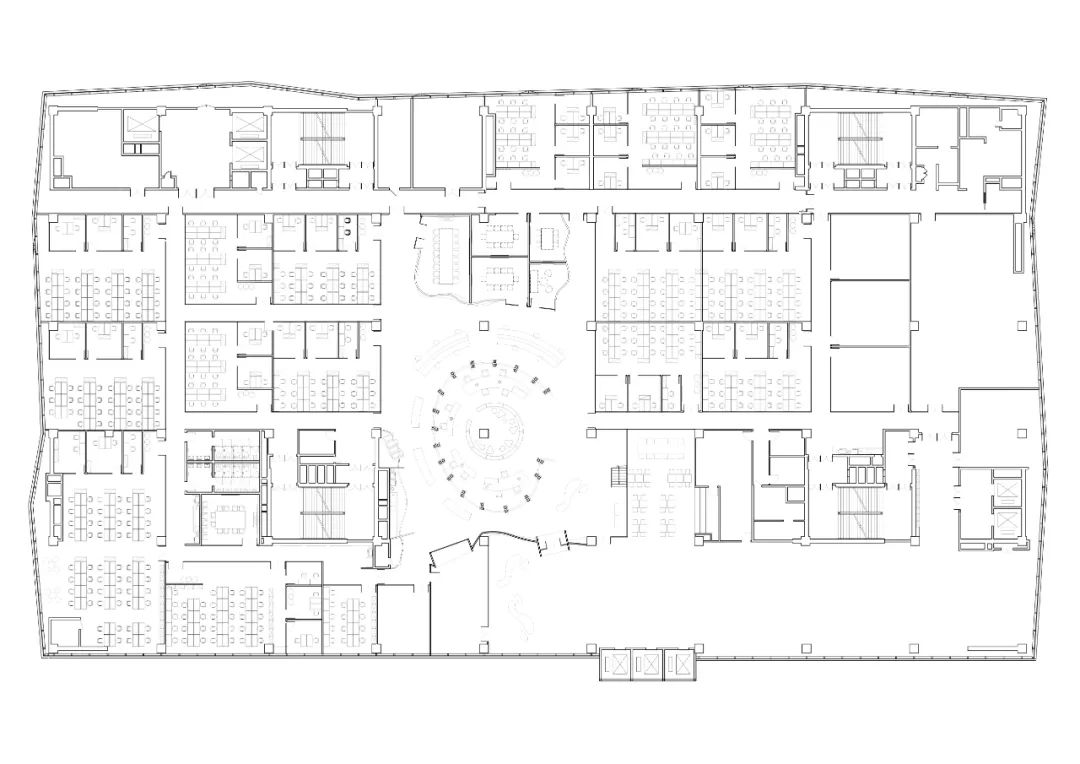 空间布局围绕中庭路演区展开,将共享功能模块布置在建筑几何中心使得空间配比相对均衡。通过增设联通各层和屋顶花园的楼梯,打破各层界限,增强空间的关联性。采光天窗增加了阳光的射入,使得进深过大的室内每个角落都可以有自然光,给办公者营造了良好的氛围。