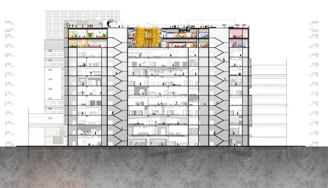 The spatial layout is carried out around the atriumroad performance area, and the shared function modules are arranged in thecenter of the building geometry to make the space ratio relatively balanced.Through the addition of stairs connecting each floor and the roof garden, theboundaries of each floor are broken and the relevance of the space is enhanced.The daylight skylight increases the exposure of sunlight so that there can benatural light in every corner of the room, creating a good atmosphere foroffice workers.