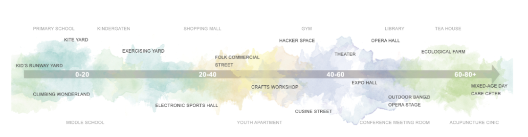 回忆是解开文化隔阂的密码。比如对于目前处于老年阶段的人来说,这密码是茶楼文化和住在四合院的记忆;对于目前处在中年阶段的人来说,密码是童年的露天电影院;或者对于现在青壮年的我们,这密码是一场四驱车比赛等等。与此同时,文化是以代际为载体的。一个60年代出生的人所体验的文化内容,和一个00后是不同的,一个60后在不同年龄阶段具有情感共鸣的文化形式,和一个00后也是不同的。因此针对某一个年龄阶段的人,所需要营造的体验是动态的。但是,在不同历史时期,不同年龄阶段的人所需要的功能性区域是相似的。比如儿童或者学生时期需要教育和培养的场所,老年人需要医疗,身体和心理健康的辅助设施。