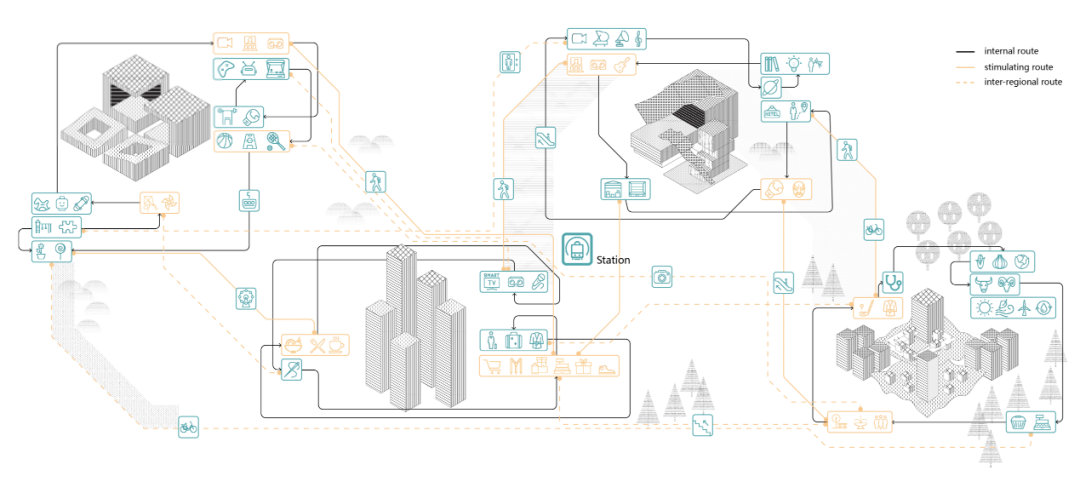 在这个文化媒体街区内所有的文化活动都有一条蜿蜒曲折的文化纽带连接起来。 这条“文化纽带”强化了人们在纽带中的连续性和流动性;在有机的功能序列中打破了代际的壁垒,在周而复始的流动中拉近了人群的距离。文化纽带的作用是模糊人群活动空间的边界;诱发人们流向不同年龄文化区,从而促进代际的文化交流,形成丰富鲜活的文化生活场景。最终达到当地文化的不断自我更新,强有力的混龄交互媒体展示,充满人性化的未来城市。