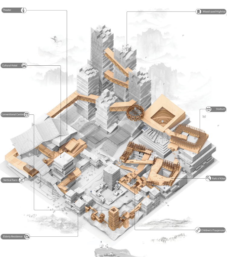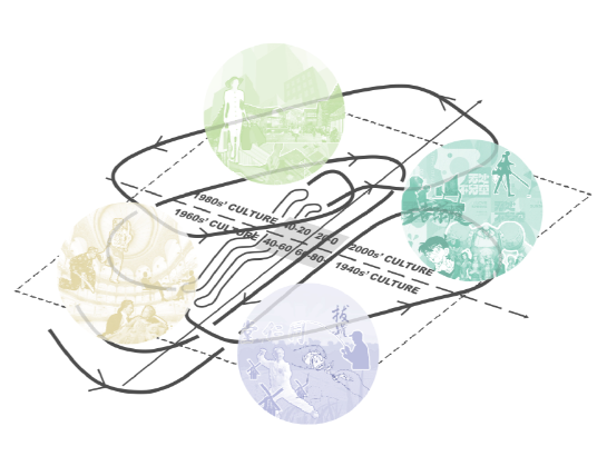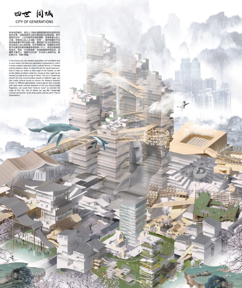 Loop Studio也和同学们一起参与这次城市复兴的头脑风暴,提出了“混龄文化社区“作为切入点的作品,再现人们对城市生活的理想:老吾老以及人之老,幼吾幼以及人之幼的“大同”。城市的魔方不仅应该包容着不同年龄的人群,更应该产生文化的纽带去拉近彼此心与心的距离。在不同世代间,有着彼此共鸣的文化基因在联系着城市中的每一个人,将这些线索提取出来,组成“文化的线索“去串联起城市的迷宫。这便有了我们以“混龄文化社区“作为切入点的作品,我们称之为“四世 · 同城。”