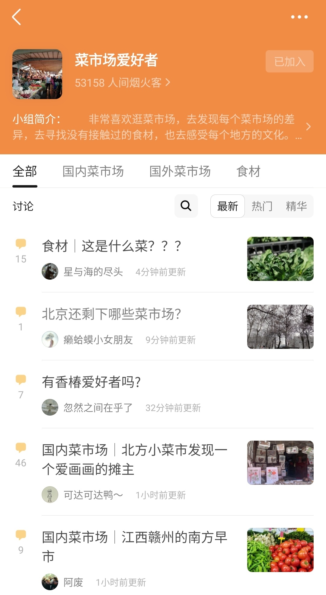 在豆瓣有个小组“菜市场爱好者”的小组聚集着5万多人,他们分享在各个城市逛菜市场的体验,分享在菜市场发现的有意思的人事物,分享自己买的菜,讨论菜价……