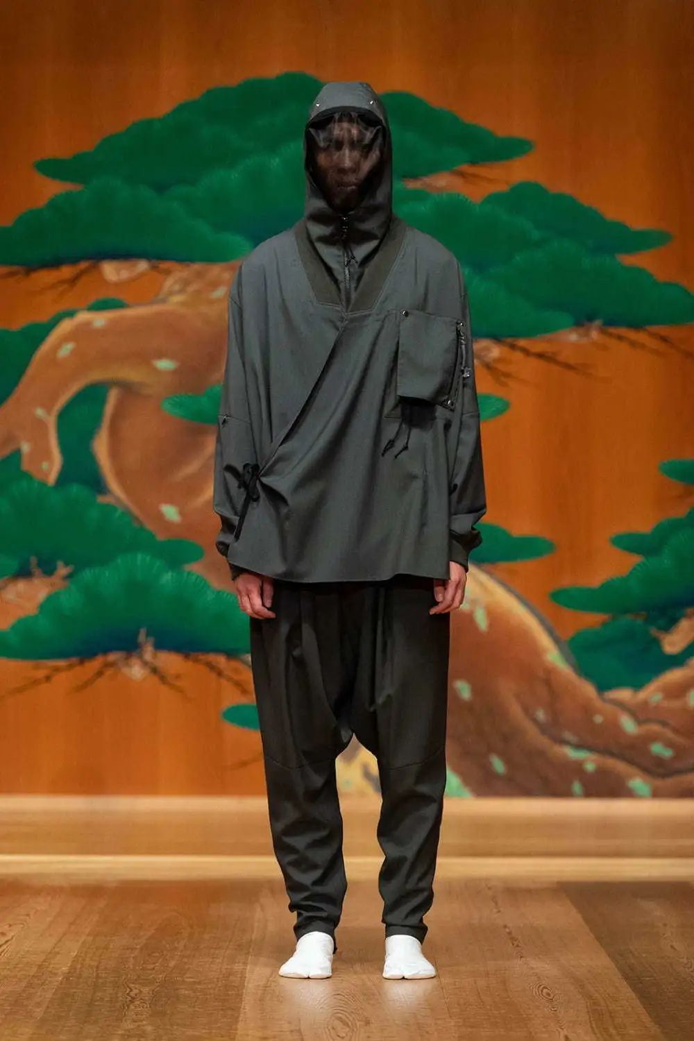 正装与运动、古典与时尚逐渐融合。拥有日式的和服领与运动休闲单品的混合设计在近一季开始流行。领口采用螺纹面料以增加舒适度,以经典廓形为基础,通过门襟版型的细节变化,为传统单品增加新意。