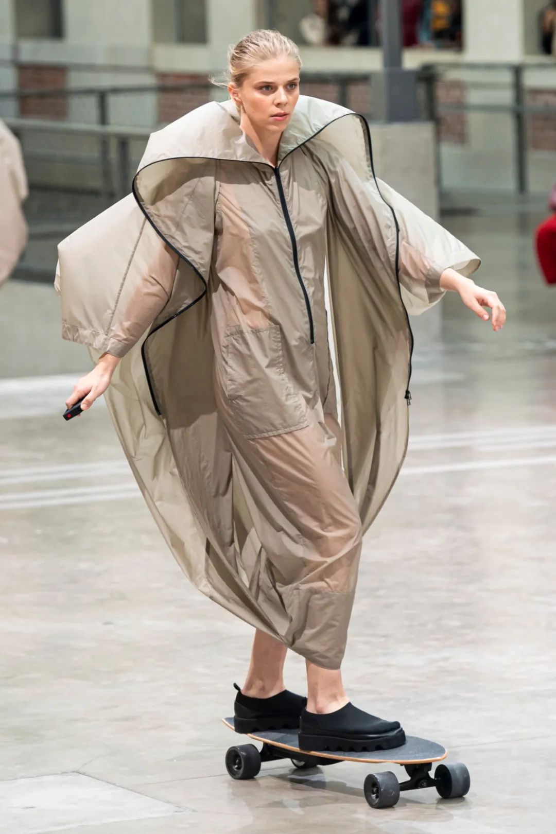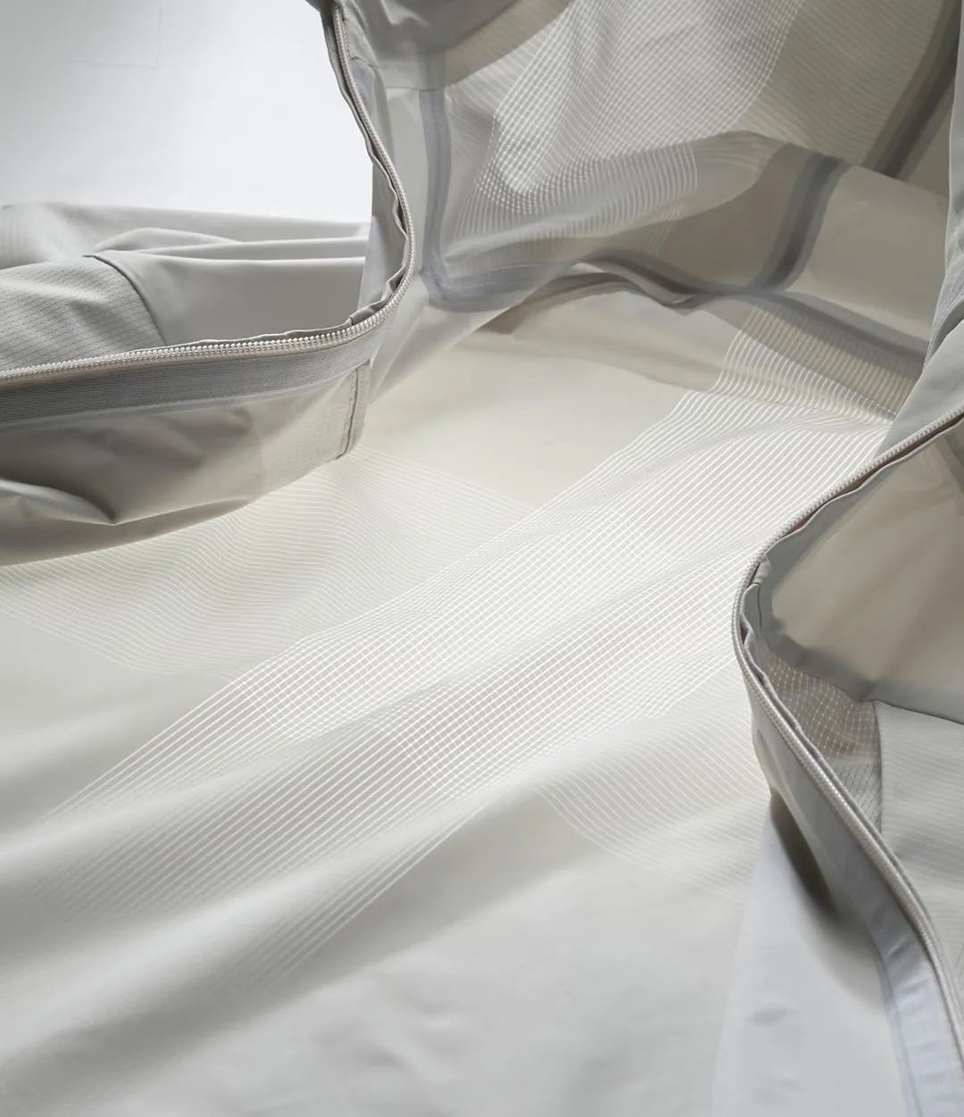 半透明透气结构面料,融入了防撕裂功效,从废弃物中提炼出的可回收利用纤维代替传统的尼龙纤维与PVC材质,强化了性能,赋予了机能面料更好的透气性与防护性。