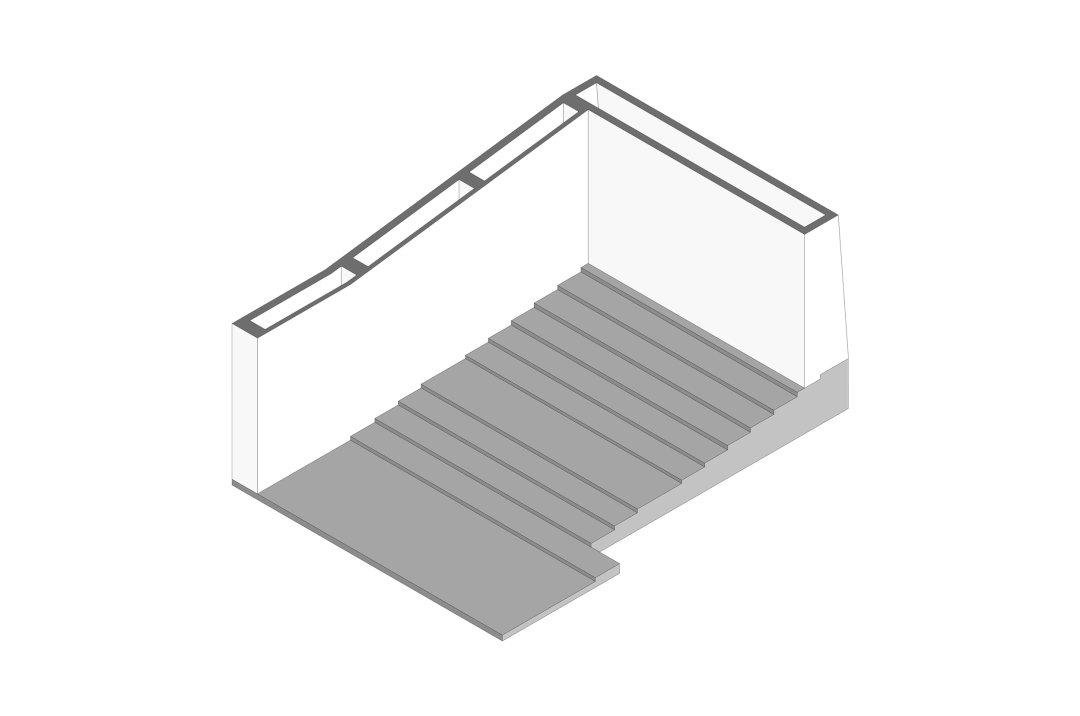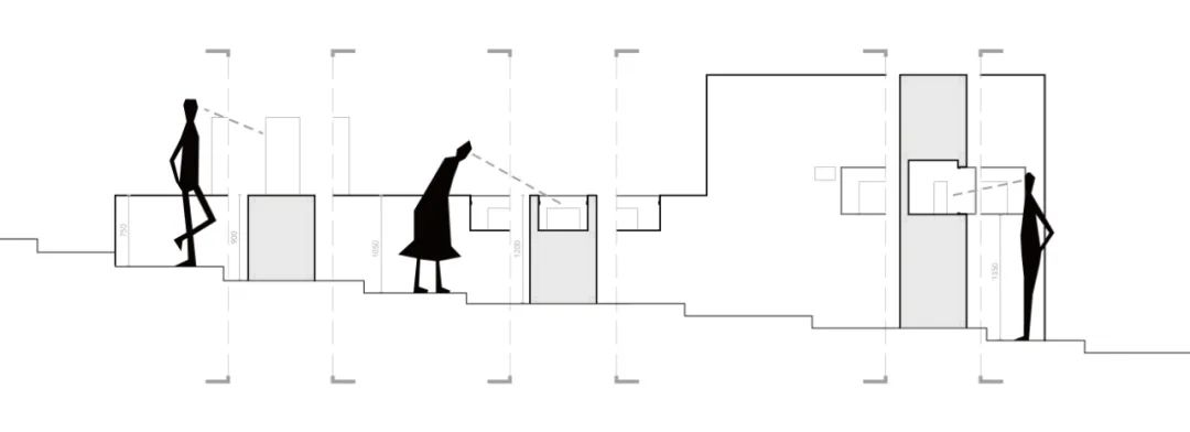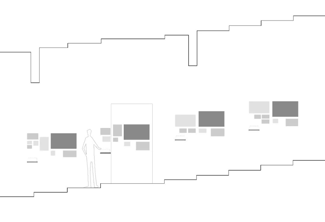 白色体块的高度设置需同时考虑不同类型建筑模型所对应的观看模式以及原始阶梯的高差变化。在前部和后部分别采用墙面展示和台面展示两种不同的方式,以同时保证序厅区域所需的围合独立性和中部展区的通透流动性。台面高度在不同的停留位置上形成的750mm和1050mm的桌面高度则正好对应台面摆放和嵌入式的不同观看方式。