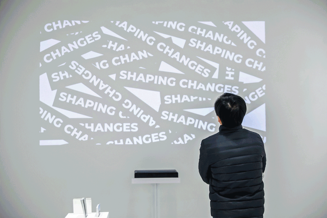 三个长宽高各异的白色长方体错落布置,在序厅内自然形成动线。长方体不同的大小及高度对应展览折页、明信片及书籍的摆放尺寸及使用方式。除了分散摆放,三个白色体块也可以形成一组整体,对内容进行集中展示。