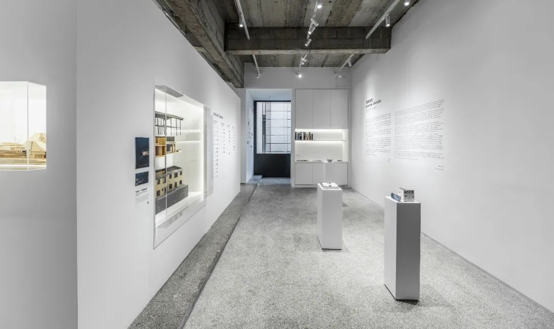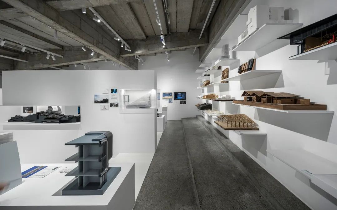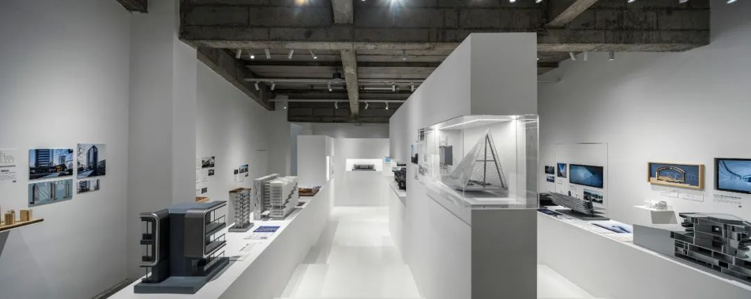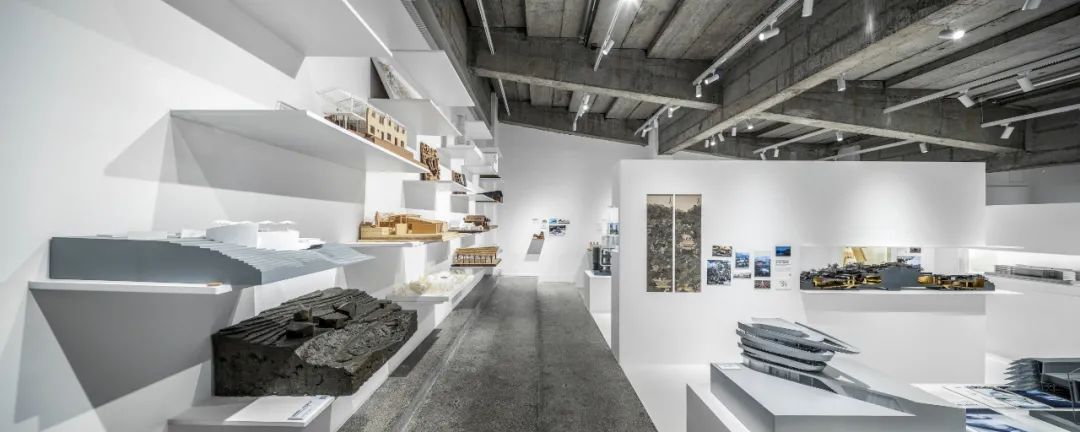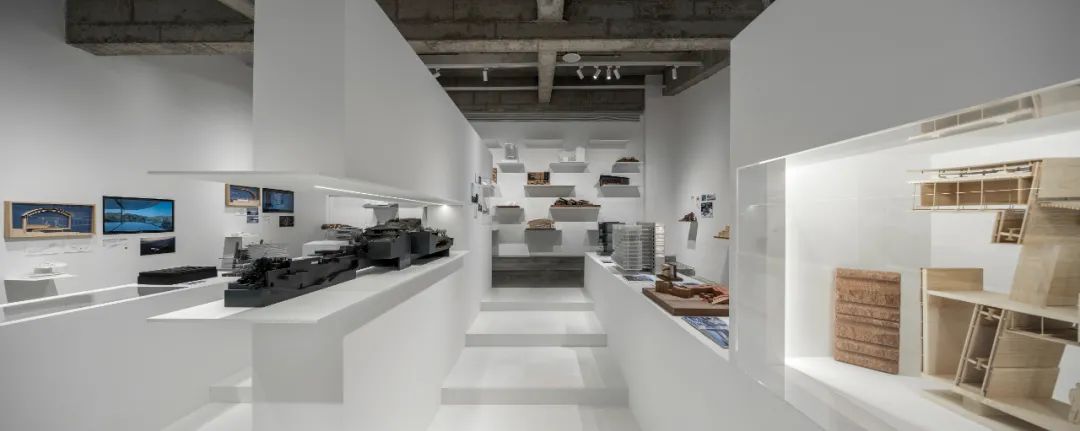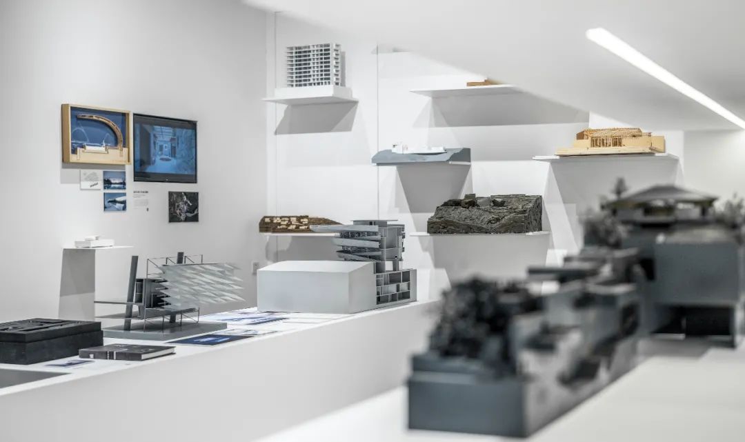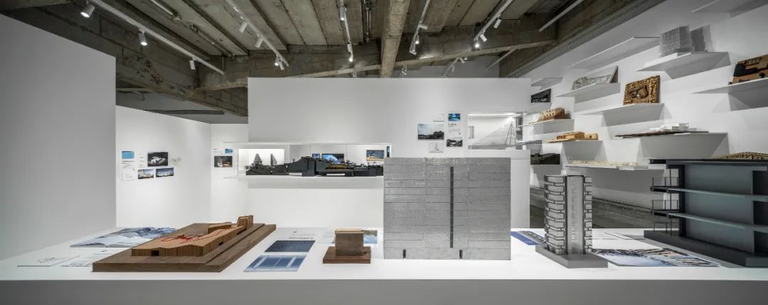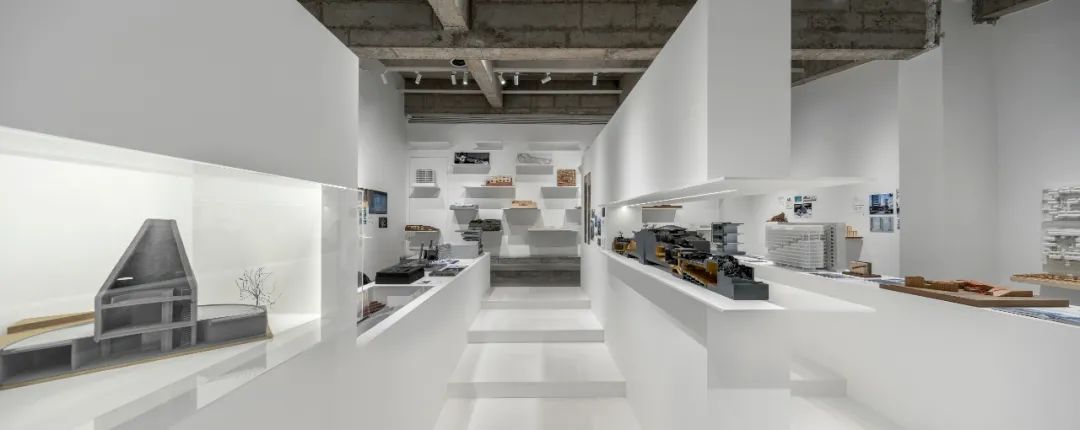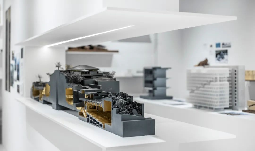 后部的模型墙面通过悬挑的白色金属板承载着不同阶段的项目工作模型,成为这个展览的背景的同时,自然地展示出事务所的项目全景。
