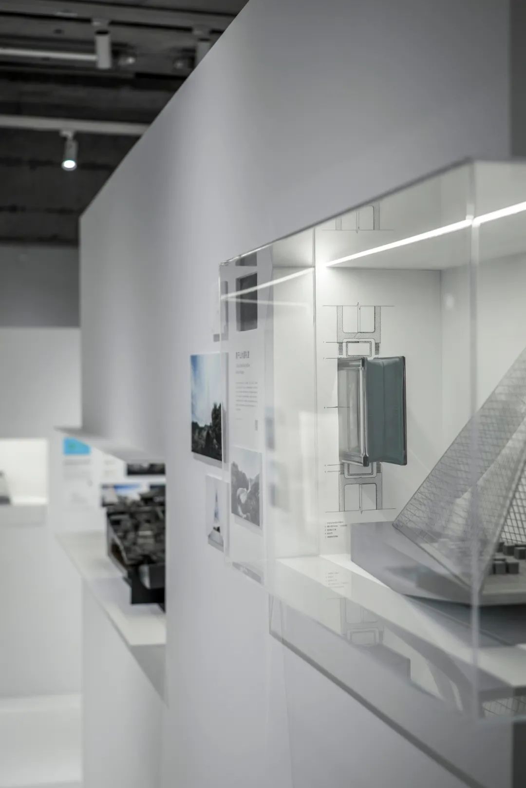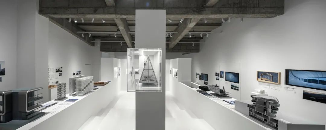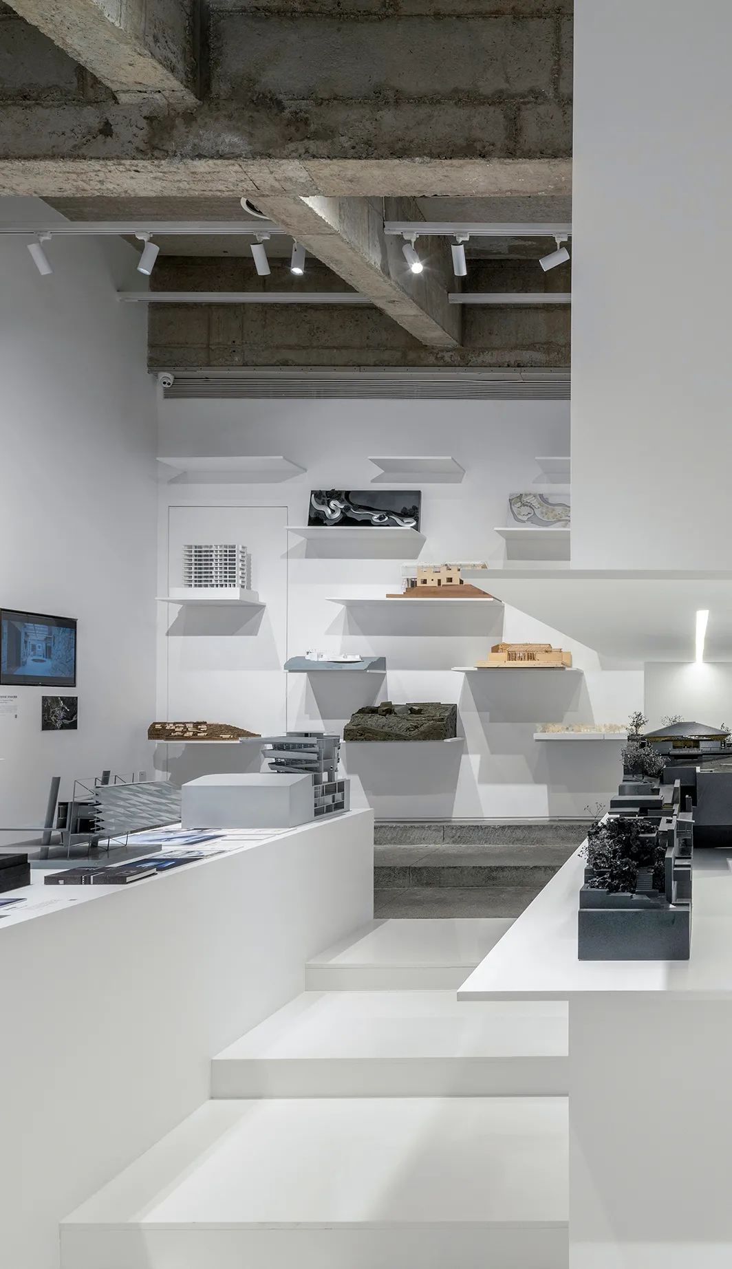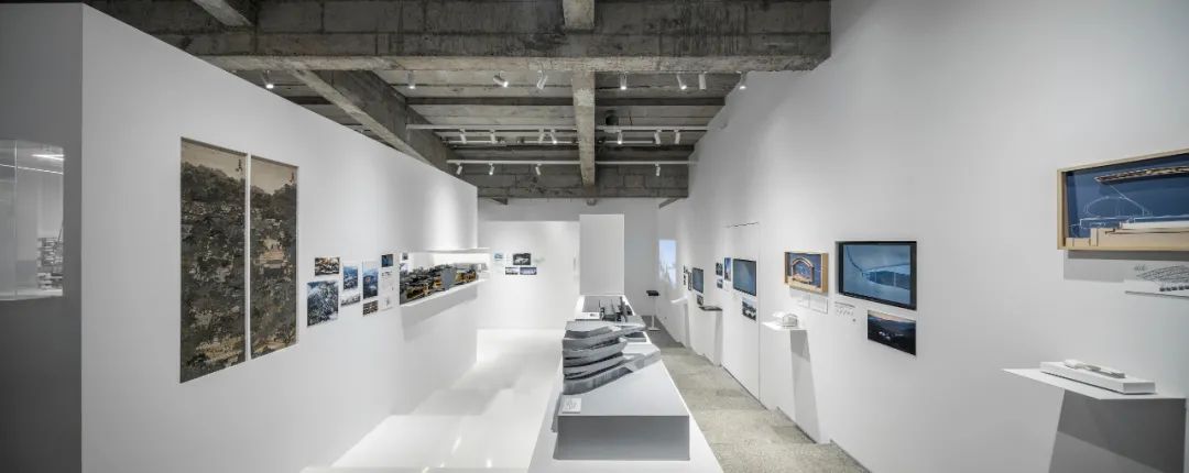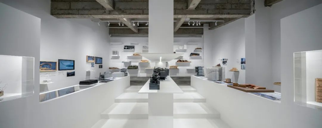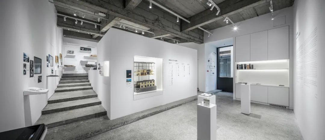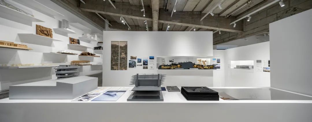 后部的模型墙面通过悬挑的白色金属板承载着不同阶段的项目工作模型,成为这个展览的背景的同时,自然地展示出事务所的项目全景。