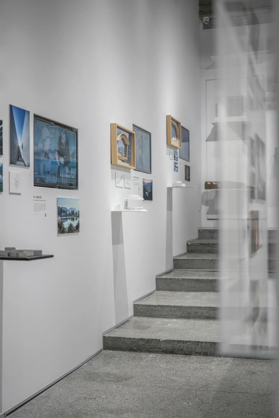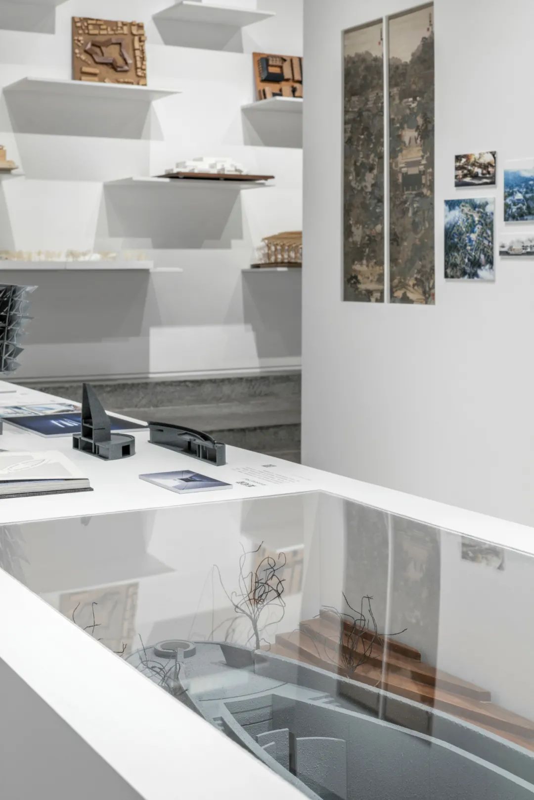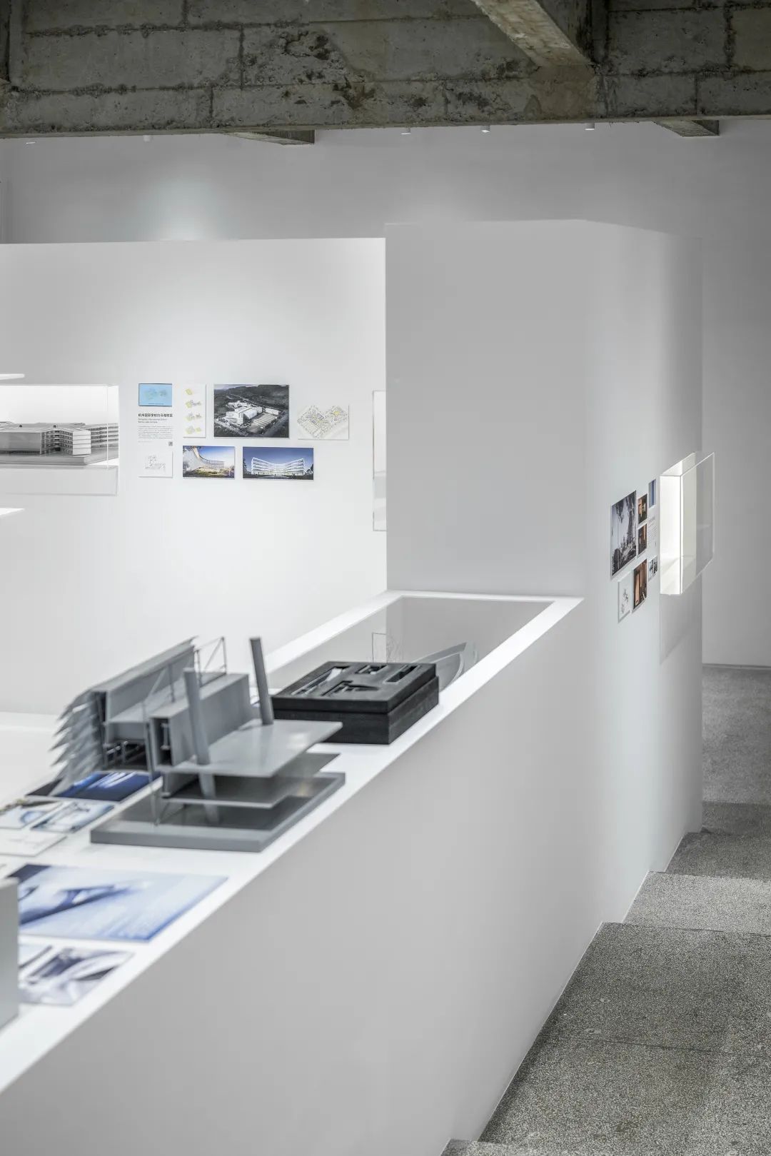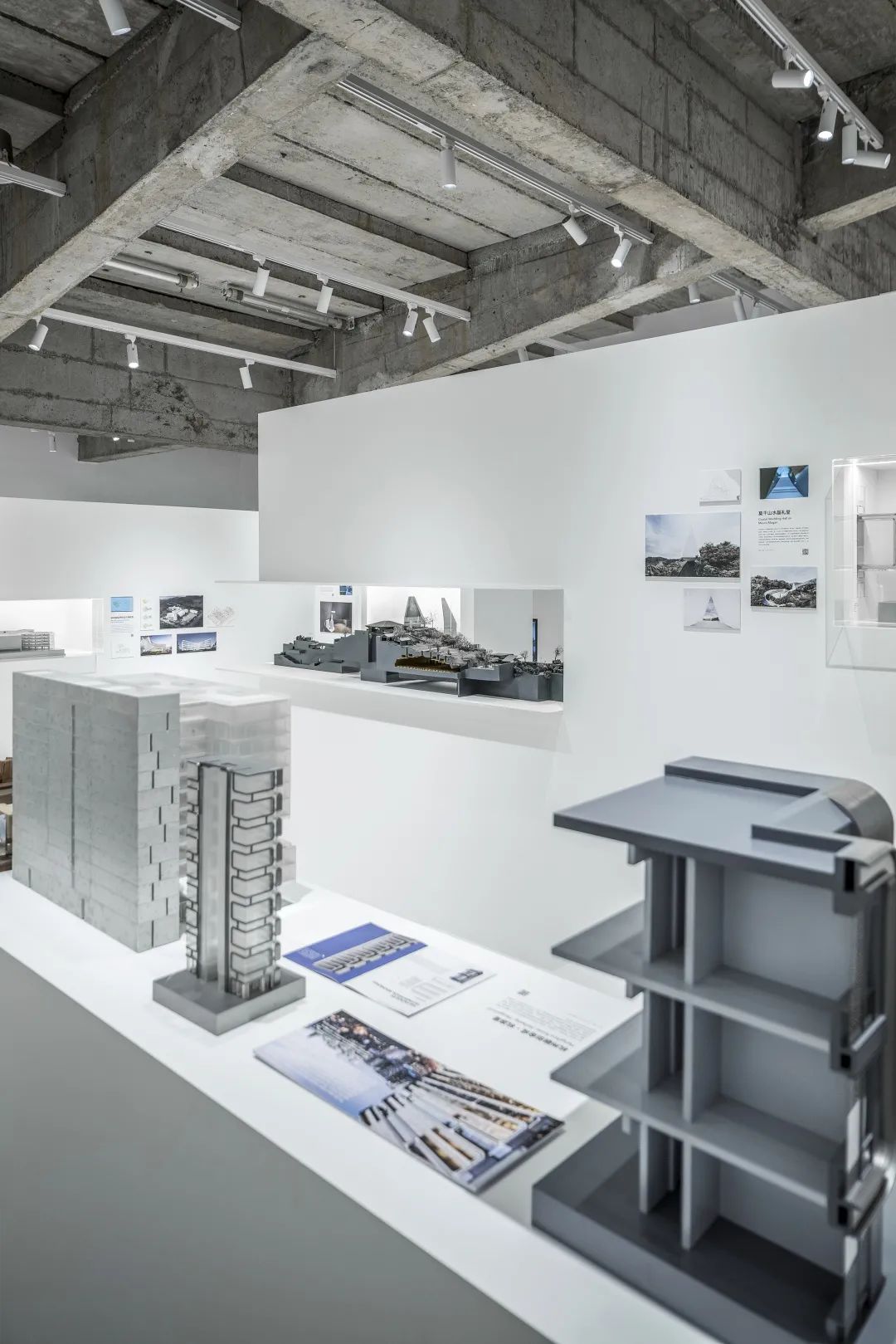 后部的模型墙面通过悬挑的白色金属板承载着不同阶段的项目工作模型,成为这个展览的背景的同时,自然地展示出事务所的项目全景。
