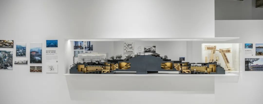 中部墙体的水平开口使得观展人和模型、观展人之间产生互动,让视线穿透的同时形成有趣的框景。开口内展示的是杭州灵隐寺西线地块概念方案(国际竞赛)项目,大尺度的整体剖面模型将场地、功能等种种限定条件、设计对现代寺庙真实的空间诉求的满足以及对千年古刹的自然回应做了整体展示,最终打造出生态、开放、公共、科技智慧型的现代寺庙文化中心。