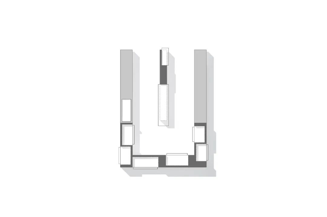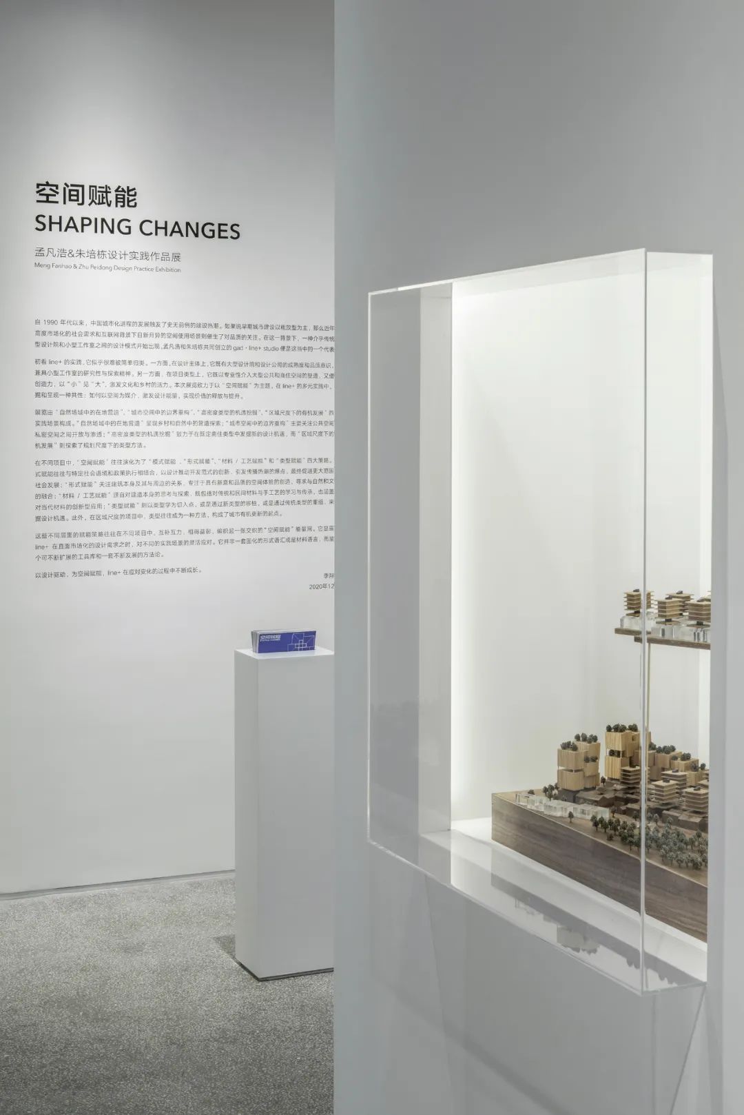 建筑模型作为真实空间的微缩最终通过大小不一的透明立方体呈现,透明立方体则错落融入纯净的白色体块,最终被富有岁月记忆的灰色空间所包裹。从空间进入装置最终观看建筑模型,犹如拆开层层包裹,获得最终的礼物。这些代表着line+在不同维度建筑实践的模型,将会伴随事务所的发展不断给观展者带来新的惊喜。