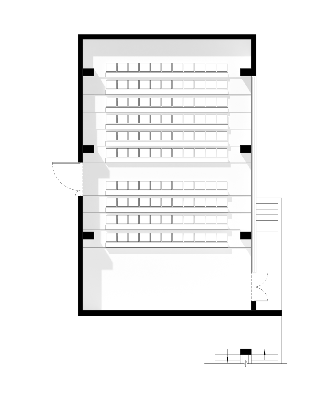 这是一个典型的80年代小型报告厅,地面和顶面都呈阶梯状。拆除原有吊顶后,裸露出了混凝土斜梁和已不多见的预制板,和地面的灰色水磨石一样,这些都是上世纪的建筑符号。我们利用柱宽在空间的一侧设立了设备腔体,并在后部切割出储藏空间。繁复的设备管线都藏入其间,以保证空间的纯粹性,凸显出顶面和地面所保留的原始记忆。