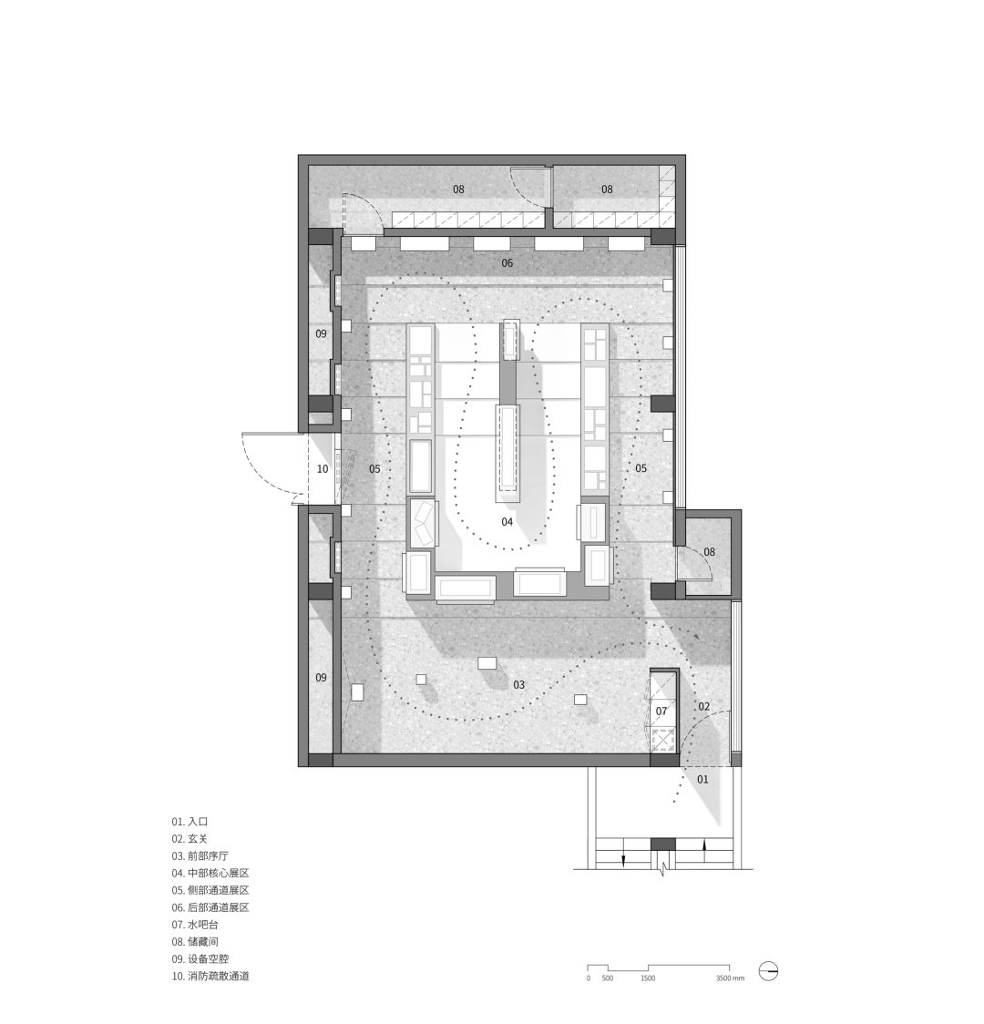 原始空间具有阶梯教室的标准平面,阶梯中部作为主入口,前部讲台一侧作为消防疏散口。功能调整为展厅后,使用人数骤减。我们将两个出入口定位对换,在保证展厅入口和公司主入口的一致性的同时,也保持展厅内界面的完整性。