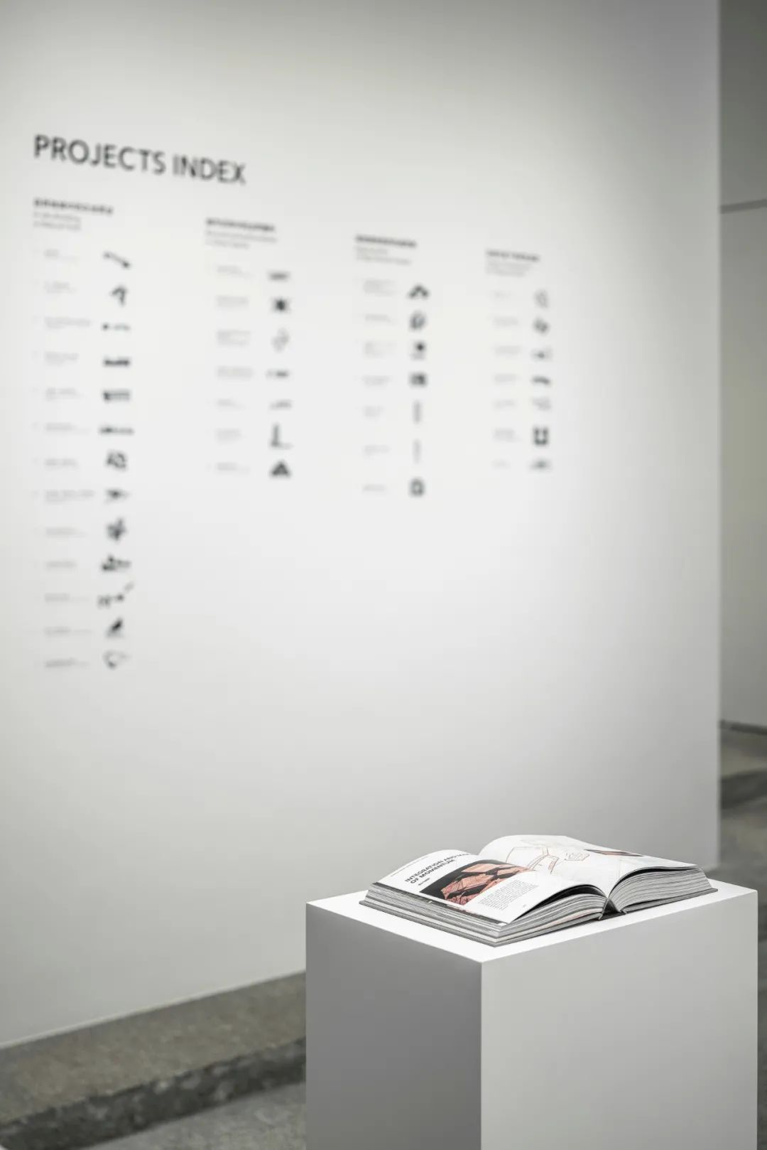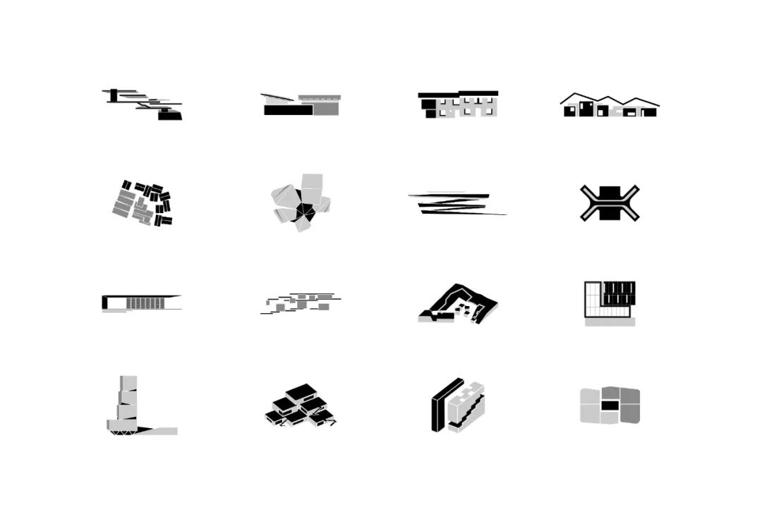 索引墙面将此次参展作品梳理为四大实践场景。通过设计特点的提取,项目以不同灰度组合成的LOGO形式出现。各个作品的LOGO最终形成的矩阵展示出事务所的实践广度。