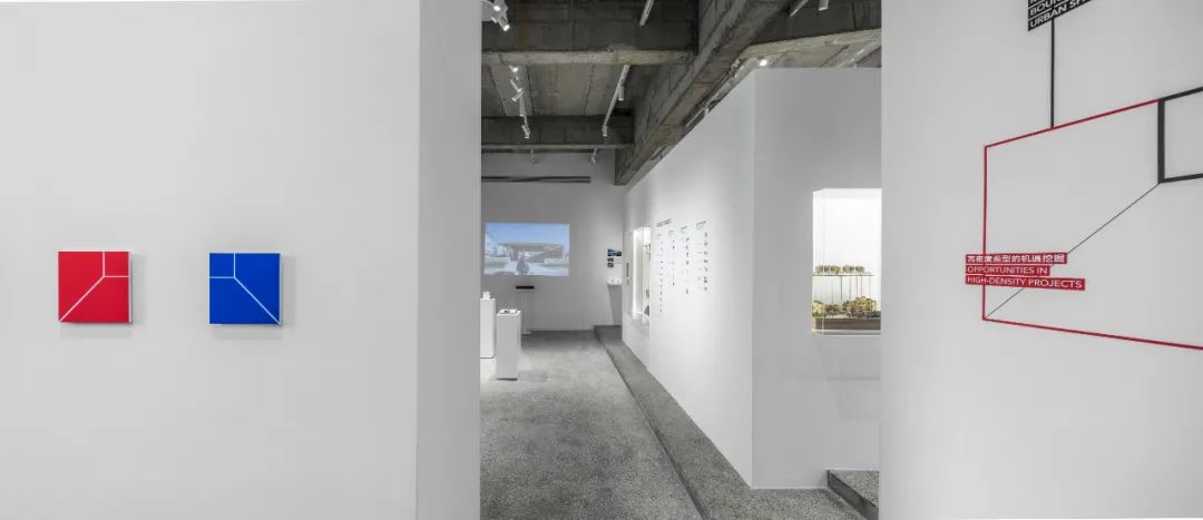 中部展区则对“城市空间中的边界重构”和“高密度类型的机遇挖掘”内的项目进行了重点展示。类型不同的建筑模型成为展示重点,搭配以内嵌的小屏幕以及重点图文。“钱塘江博物馆”通过剖面模型来表达该项目中“全时段公共空间”的类型创新,体现出line+对如何打破城市公共和私有之间的固有界限,创造出更富流动性和开放性公共空间的思考。