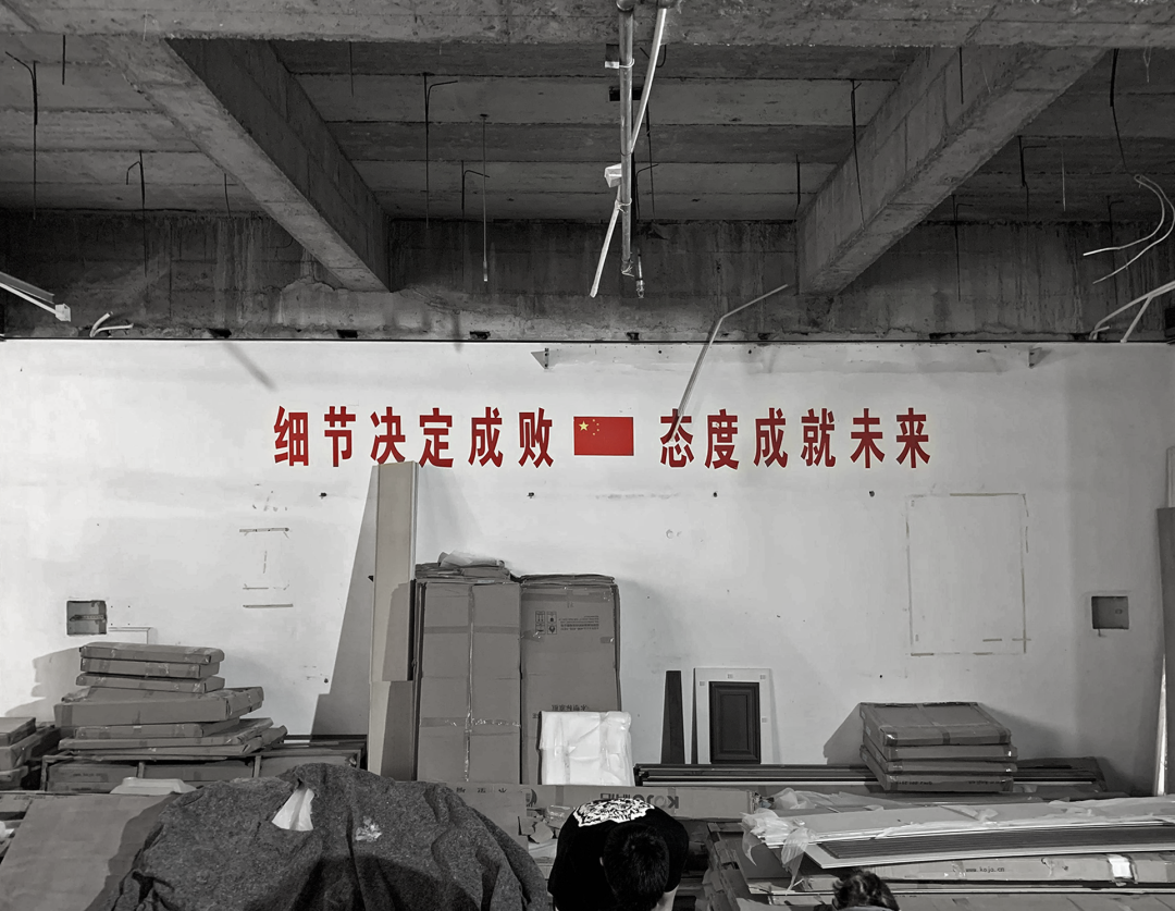除去透明的亚克力,白色是唯一引入空间的颜色。通过对材料种类和颜色的控制,新建的装置和留存的基础相互映衬。所有墙面均使用白色乳胶漆,利于丝网印刷及后期调整。白色体块的地面采用预制成品白色水磨石,和墙面形成整体。