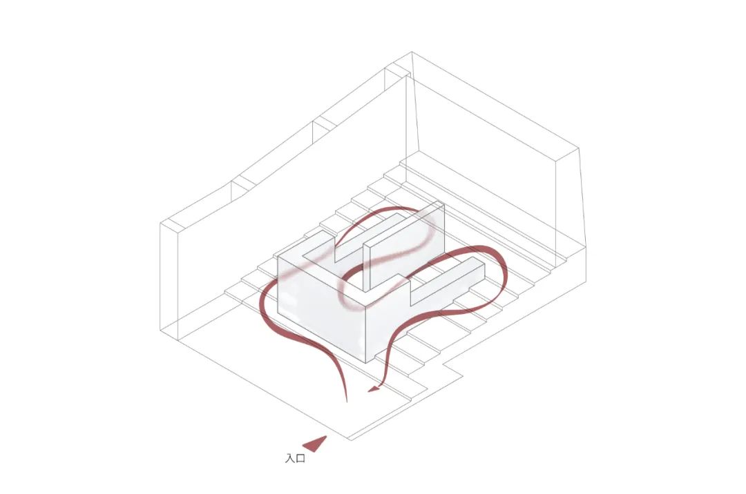 在仅有的120方的面积内,我们需要改变先前一览无余的空间状态。白色体块作为一个整体装置在空间中心落座,成为视觉核心。展厅空间由此分隔为前部序厅、中部核心展区及侧后部通道展区三个部分。