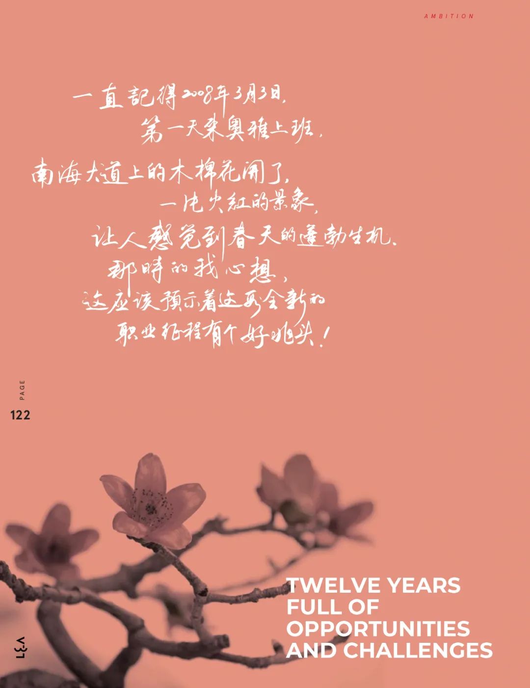 刚收到《与奥雅书》,就带着它一起踏上差旅的路途。在高铁上,翻开它时,看到作者们的照片和风采,以及描述的一个个回忆和故事,都是那么的亲切与熟悉。这些“书信”,有味道、有画面、有温情、也有祝愿……这些奥雅人的心声,让我不由得想起自己在奥雅这个平台一路成长的历程,如今再回首,已是十五载。在奥雅大家庭里,每位家庭成员都更有责任心和使命感,在这片宽阔的天地里,我们有更多的机会展翅翱翔。让我们一起去创造更美好的下一个20年!