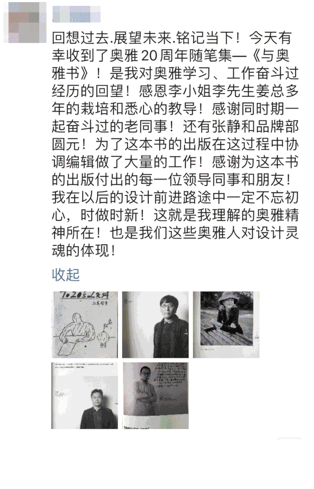 “刚拿到手就读完了,其实没有想到会读的感慨万千的,看到那么多的年轻设计师因为各种各样的理由来到奥雅,在这里工作 生活 结婚 生子,看到他们的喜怒哀乐甚至人生苦难,忽然之间感受到了设计作为一份职业的重量。那些在客户 款项 工程之间周旋的岁月身影,忽然高大起来……”