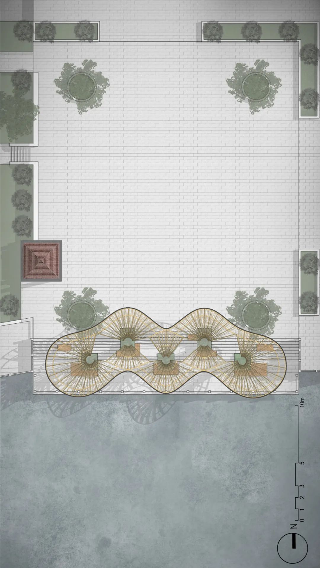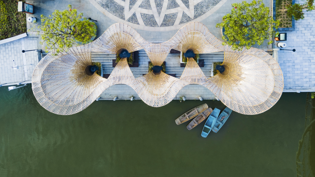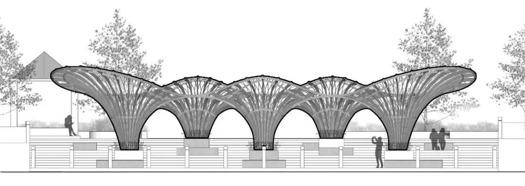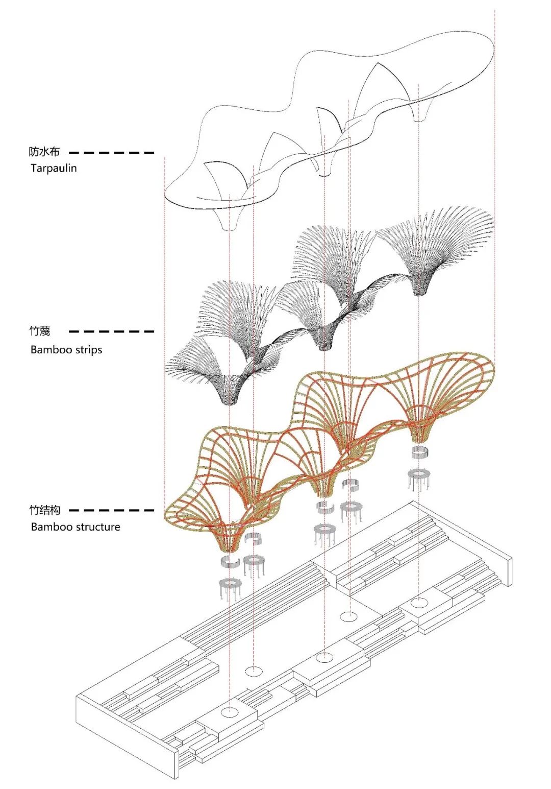 表面的竹片编织一方面为内部空间提供丰富的光影变化与遮阳环境,另一方面蒙皮效应增加整体“伞”状结构的稳定性与整体性,顶上还铺设透明防水胶片为结构与空间遮雨;从单边悬挑升级为受力更稳定的双边悬挑,模糊了黄龙滨水竹廊正反面的区分。