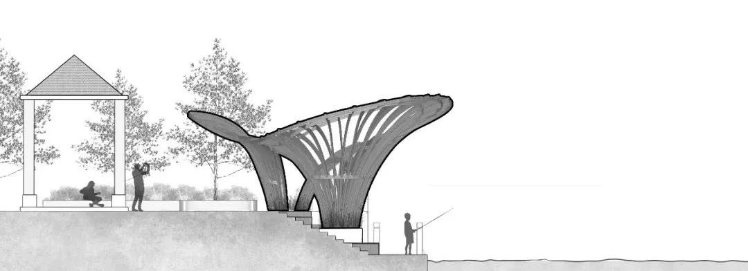 于是我们选定了在滨水台阶处搭建一个滨水的竹廊,希望通过建构滨水的竹廊,给享受黄龙村水乡风情的居民与游客一个阴凉之所。 滨水竹廊采用双边悬挑方式,利用原竹的韧性,实现结构表皮一 体化设计。 与台阶结合,提供最大化的滨水灰空间,该竹廊底下可承载多重活动功能,集休憩娱乐、观影水上剧场、码头等于一体,激活焕发黄龙村的新面貌。