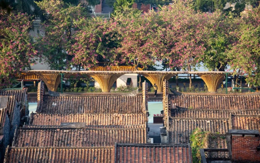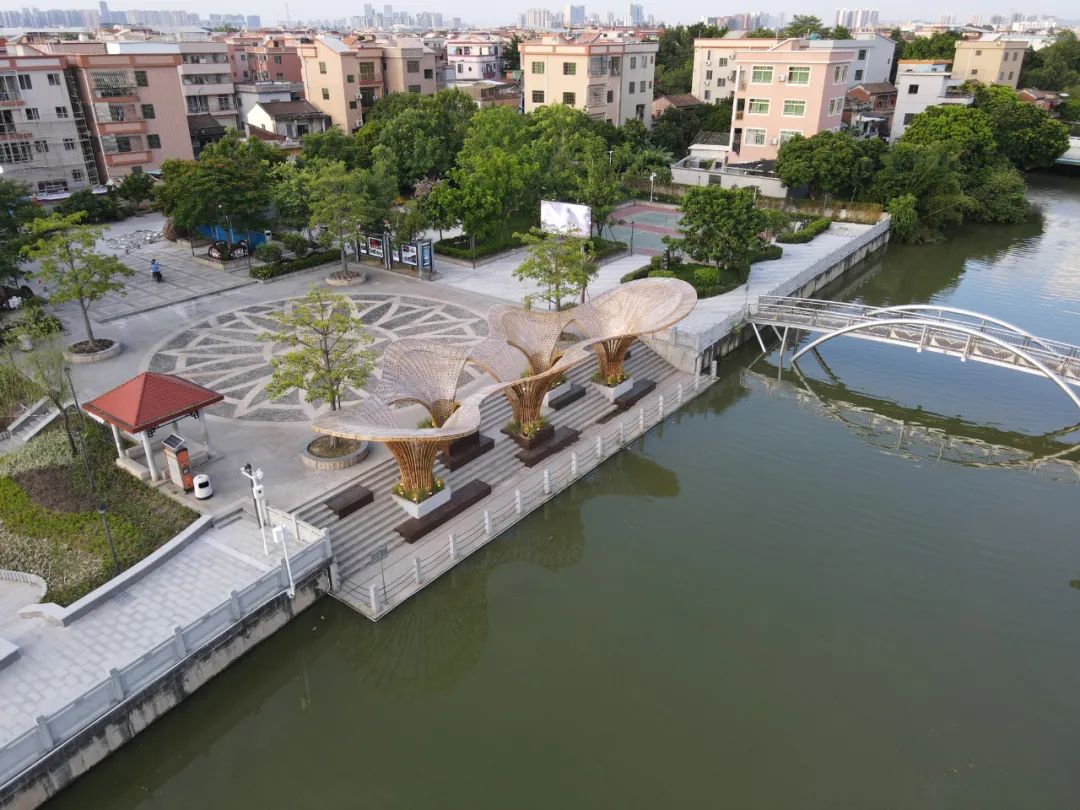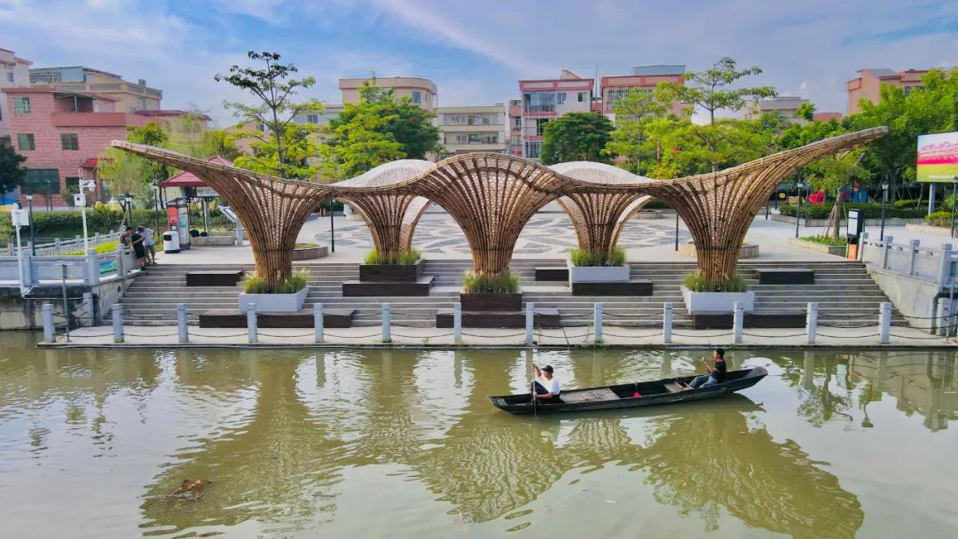 黄龙滨水竹廊 2.0位于广东省佛山北滘黄龙古村,北滘,古称“ 百滘 ”,意为“ 百河交错、水网密集 ”,典型的岭南水乡内滨水的灰空间因其气候适宜,在黄龙村,大大小小穿插在村子里的公共空间是黄龙村最具人气与场所魅力的活动场所。融合自然而更成为居民们生活、闲聊与娱乐的亲水营地。