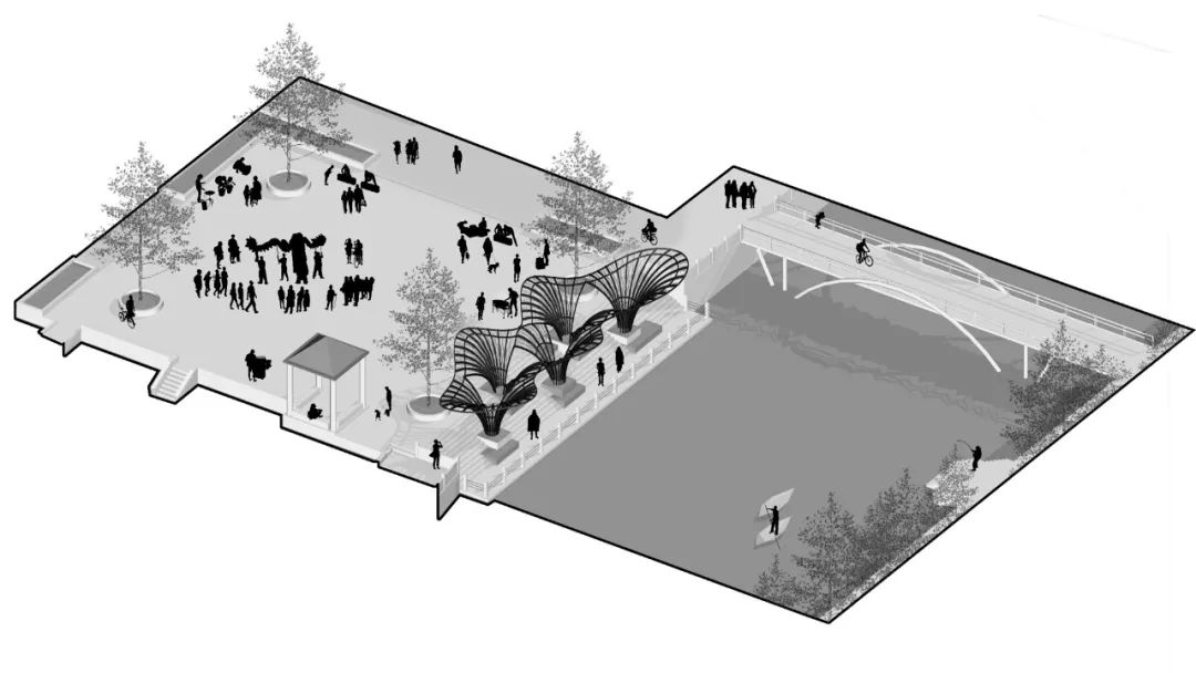 竹廊选址在黄龙村中心新建的鲤鱼沙公园,鲤鱼沙公园内虽拥有充足的广场空间与滨水景观,但缺乏茂盛乘凉的植物景观和遮阳避雨的休憩场所而人迹罕至、缺乏活力。在场地调研的过程中,我们发现公园内滨水的跌级台阶处经常有村民在这里钓鱼和活动,如果能够增加一片遮阴,应该能够将这里打造成一个很受村民和游客欢迎的的空间。