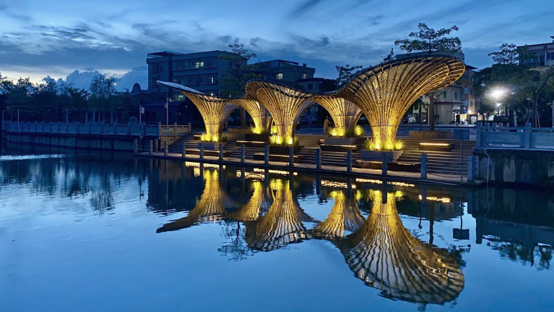 黄龙滨水竹廊2.0是长岐球场竹廊方案的延续,竹廊2.0再次尝试延续低碳自然的原竹材料的现代设计与建造,结合乡村传统竹编的手艺与美感,为滨水台阶提供一个悬挑无 柱、视线通透、遮风挡雨、不影响活动的灰空间。