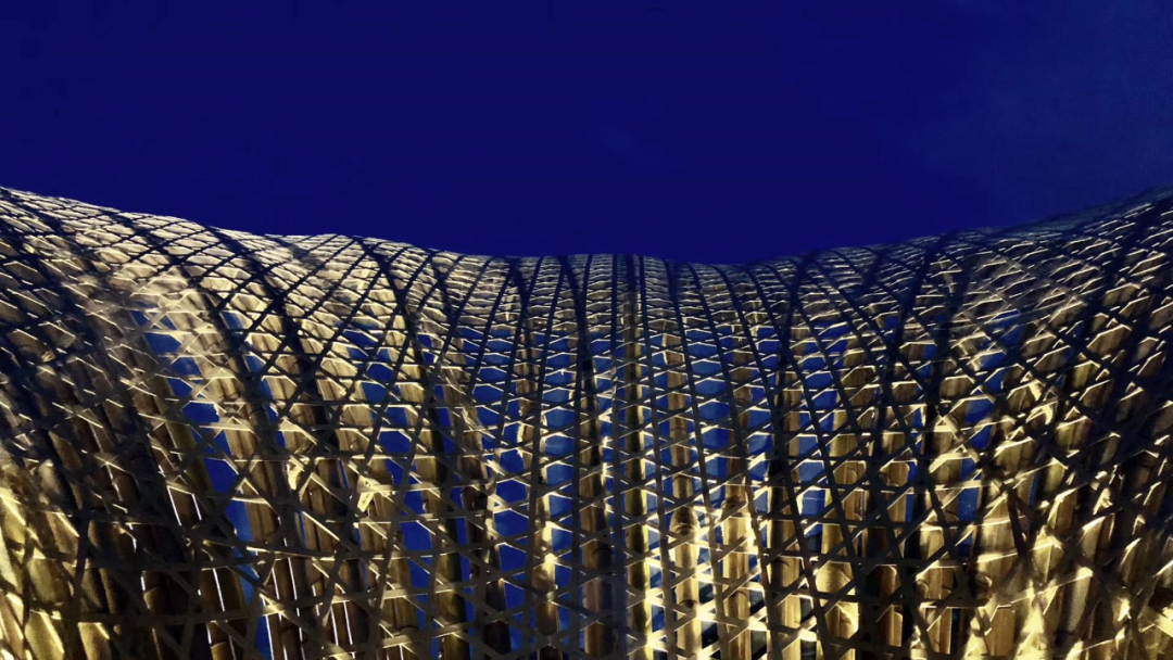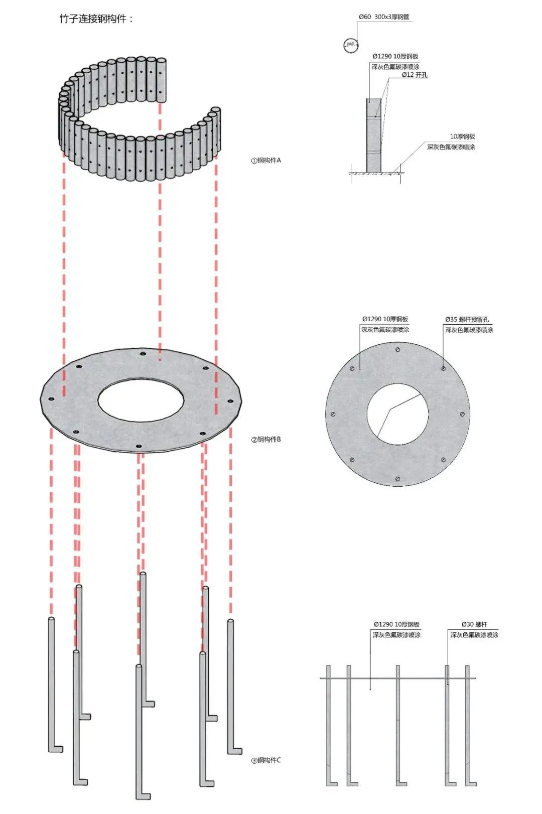 结合长岐村篮球场竹廊1.0的经验,我们优化了“结构表皮一体化”的结构选型,通过束柱的方式让原竹错缝拼接达到更长的悬挑长度,内部隐藏的钢骨架协同受力与协助找形。