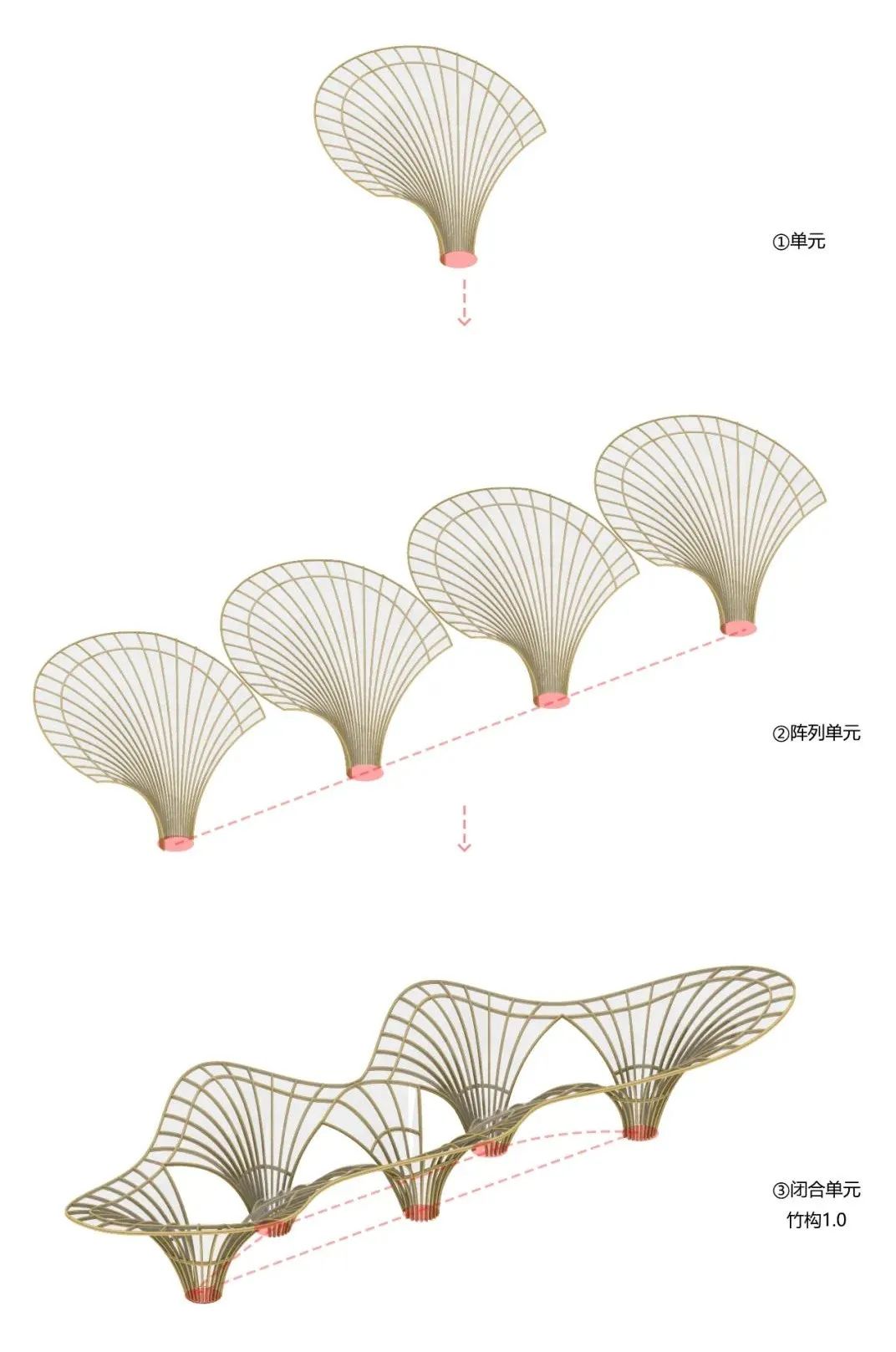 通过结构优化,缩小竹柱直径,最大化悬挑深度,伞面直径达9.3米;从建构上探索更符合竹材建构与耐候的设计逻辑,突破长岐村1.0单体模块化导致整体造型单一重复的限制,转向黄龙竹廊2.0的原竹构件模块化,从生产的角度单体模块化和构件模块化的建构逻辑是一致的,在设计上实现二维曲线拟合三维双向曲面悬挑结构,实现了施工二维化、扁平化,更有助于原竹实际工程推广与应用;长岐村竹廊的工匠营建队伍也参与了黄龙滨水竹廊的营建,设计与建造团队共同进步。