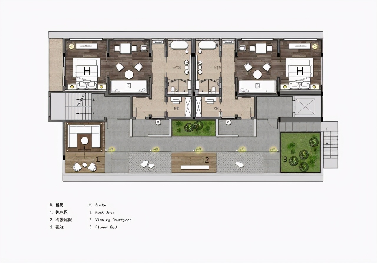 庭院借鉴中式园林的理念,院落用三米高的竹林进行围合,塑造出礼仪层次,确保了庭院的独立性与私密性。酒店南侧有一栋原始建筑,为了避免其影响庭院的景致,设计师将这一范围内竹林高度提升至六米,达到完美的障景效果。移步庭院,空间回合婉转,景观层层递进,水榭、花木相映成趣,一步一景,步行景深。