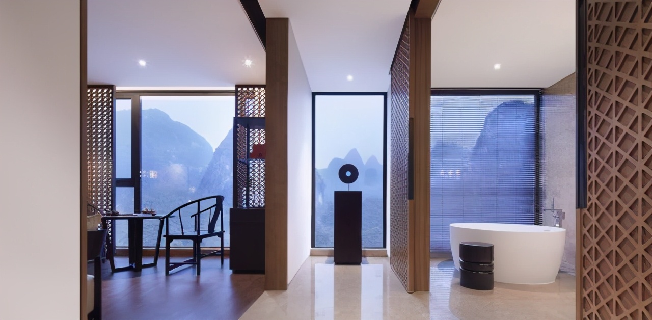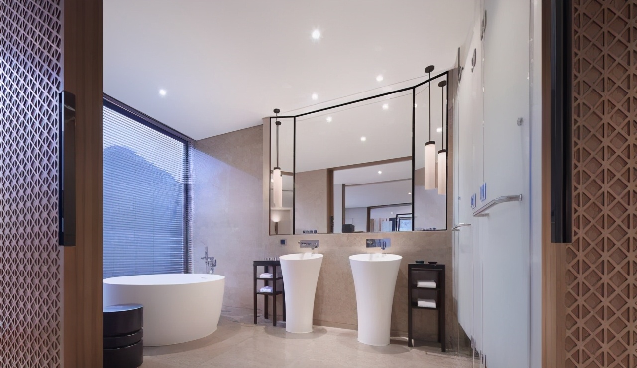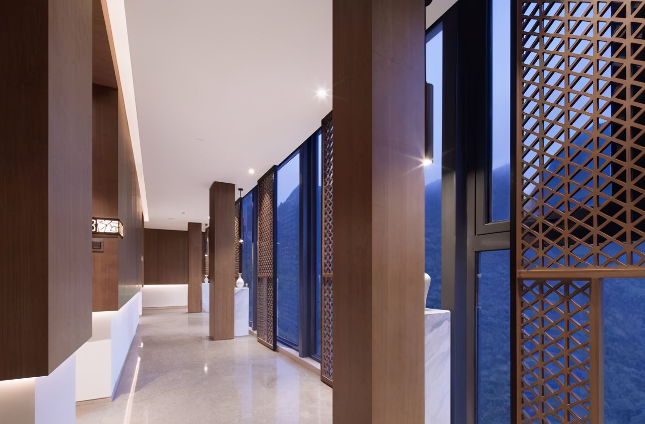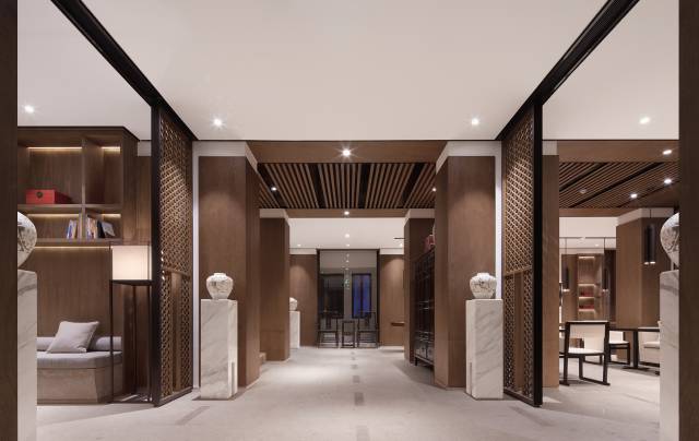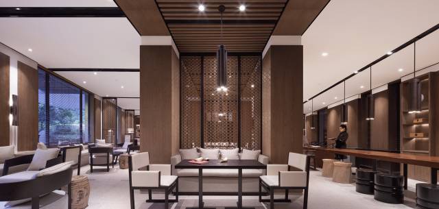 大堂采用对称的设计手法,传达出新中式的秩序美学。简洁的线条则充满现代时尚感,在演绎传统的同时,也更加符合现代人的审美方式。清雅低调的木质材料,打造的书吧,茶室,呈现出沉静的气韵,镂空屏风与光影相映成趣,散发着素雅的东方气质。