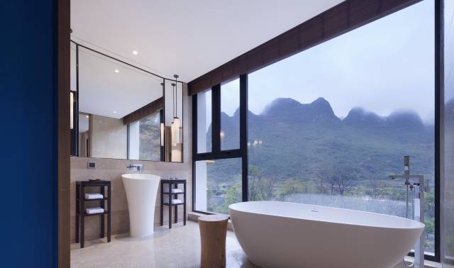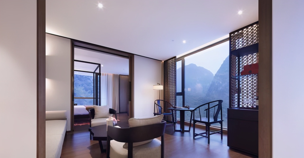 酒店共有二十六间客房,根据不同的朝向景观和面积进行合理的划分。设计师提取出具有代表性的地域色彩应用在客房区域,创造不同的情境体验,使空间更具自然的灵动与生机。大面积的落地窗将自然景观引入室内,临窗而立,将景致尽收眼底。