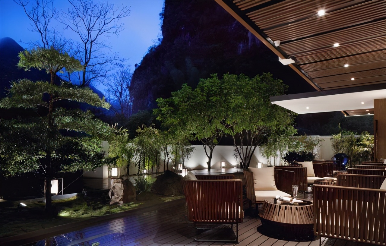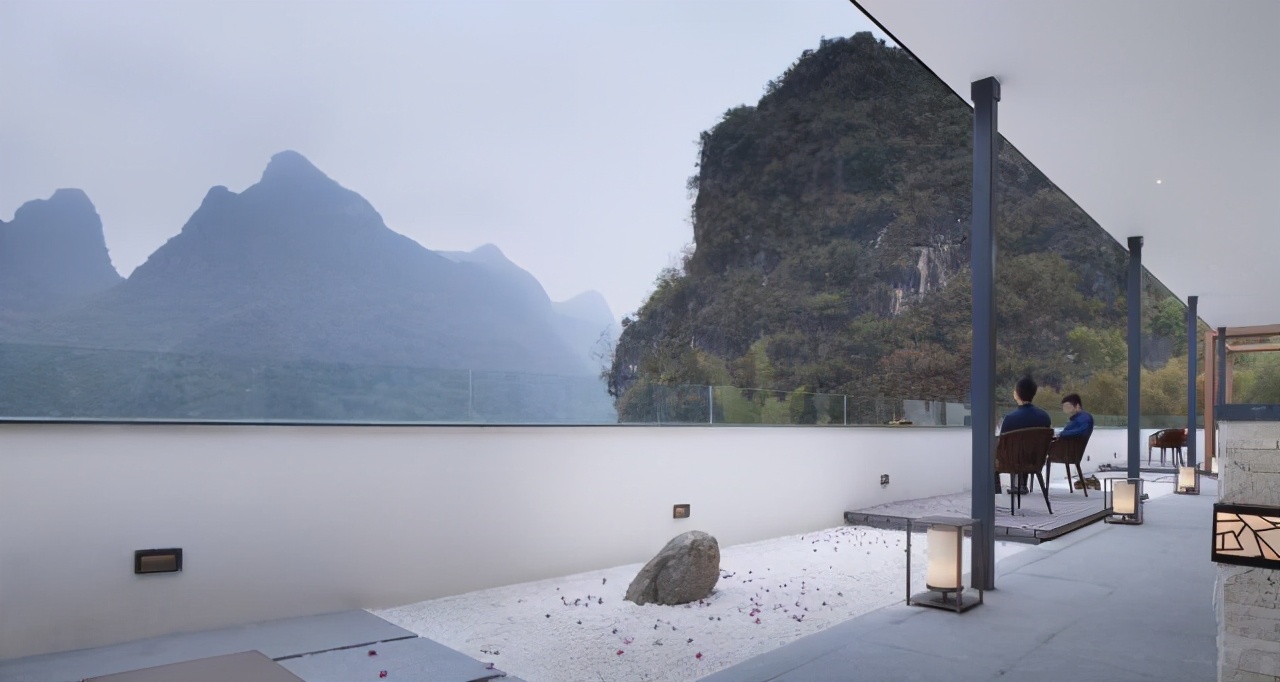 酒店顶层设置了一处观景庭院,放眼远眺,是一望无际的山景,缭绕在云雾间。淡然的幽蕴气息带来宁静的空间意境,那是人与自然的和谐境界。有景如此,足以让身心融合于自然中,游走于文化间,远离喧嚣,享受心灵的自由。繁花若梦,悠然其间。