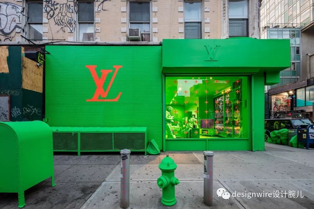 在占地6000平方英尺店铺内,桌子、椅子、灯具、小雕像被粉刷成绿色,并摆放着来自视觉艺术家Adrian Wilson的“ Louis Siton”喷雾沙发。室外的消防栓,垃圾桶和垃圾袋也被喷成绿色,将视觉进行延续。