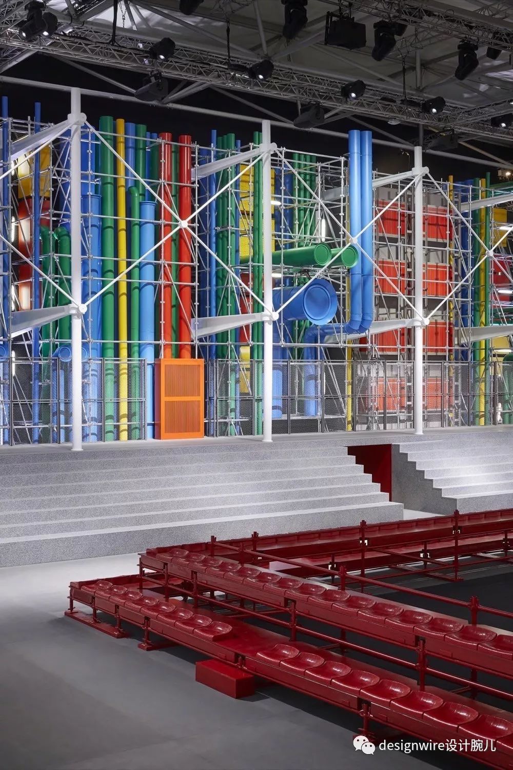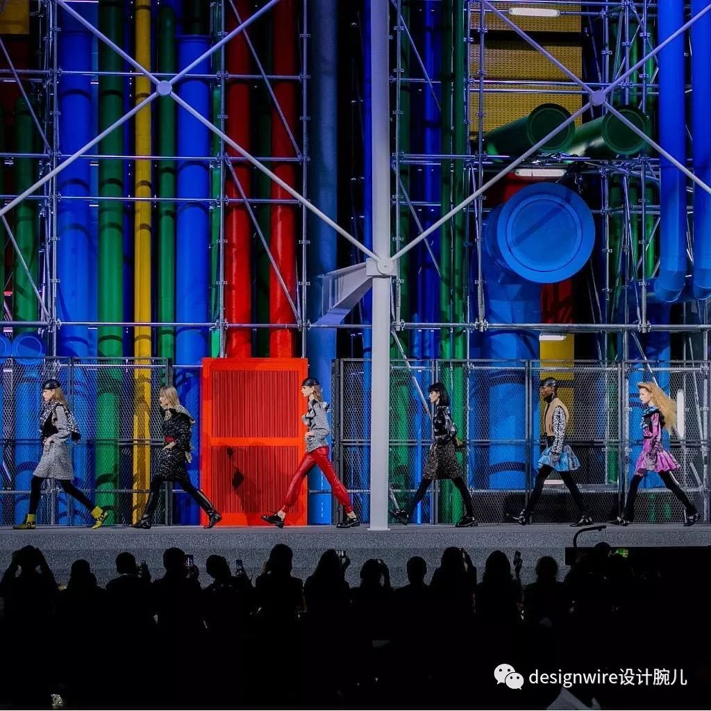 秀场中模特们穿梭于一个一个秘密的色彩管道,进入到观众的视野中。如今,蓬皮杜中心如埃菲尔铁塔一般已经成为巴黎的标志性建筑,LV的秀场再一次在大胆构筑空中间强调自我。