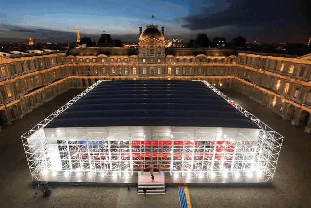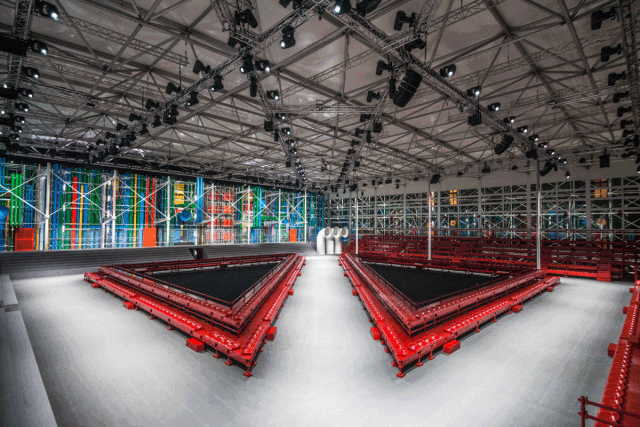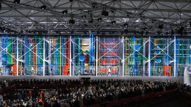2019年,Louis Vuitton提取了蓬皮杜艺术中心的建筑特色,将秀场空间搬到了卢浮宫前的广场。
