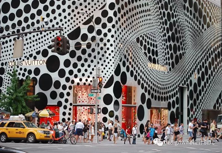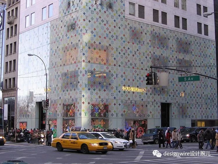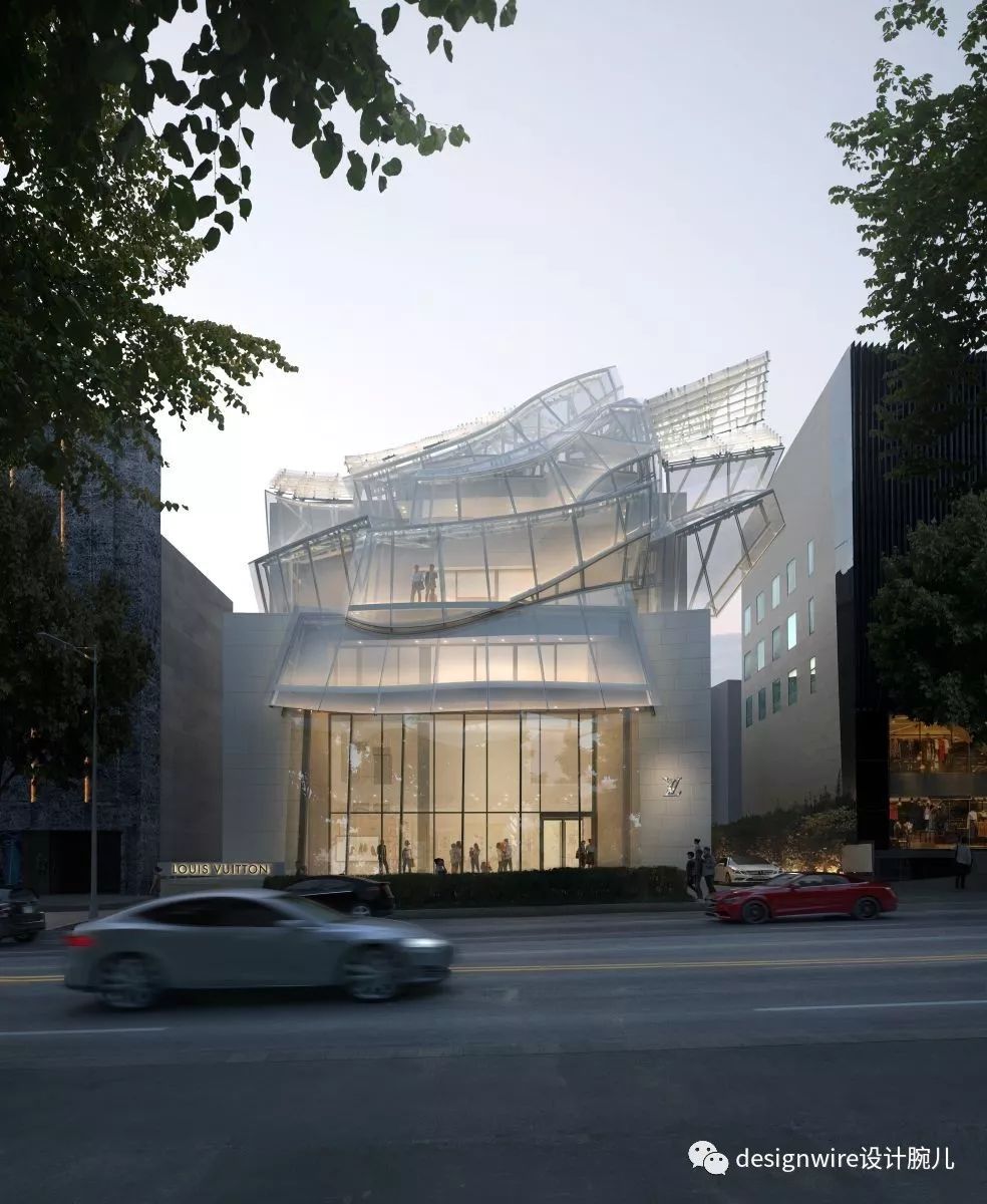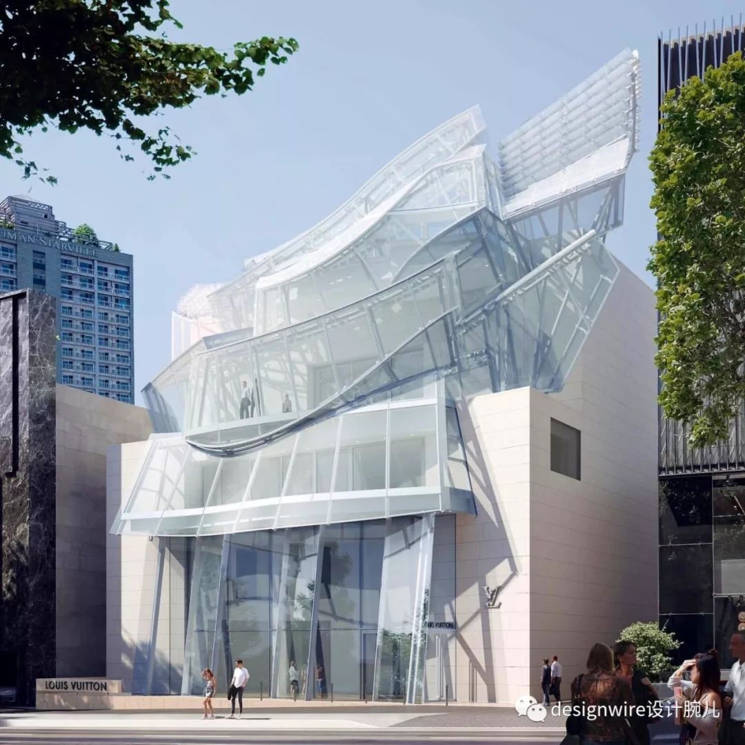 原设计由青木淳在2004年完成,从原本古朴纯净的白色雪花石膏镶嵌混凝土单元的建筑立面,经过三年的修建,变成了戏剧化的波浪形,也代表了路易威登走向年轻、街头化品牌调性的决心。