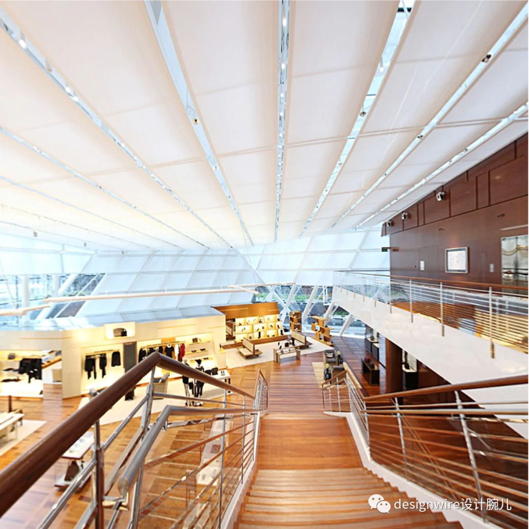 商店门面全部采用玻璃结构,前厅与窗格呈不规则的之字形曲面,引领顾客通往一排封闭的露台。外立面上方装置着波浪形的百叶窗板巧妙实现了建筑与自然景观的融合,予人“飞翔”的视觉印象。
