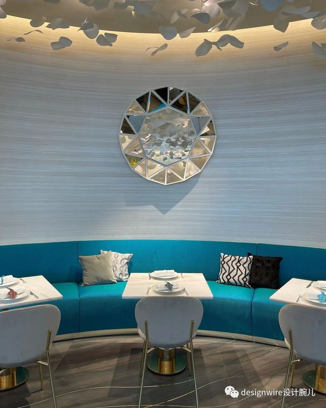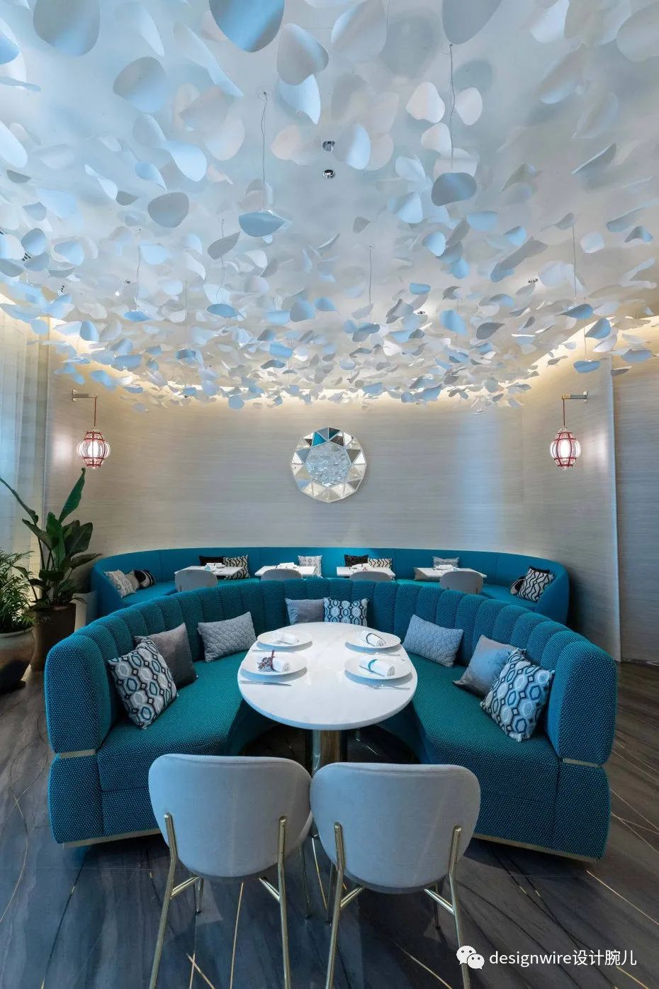 餐厅Sugalabo V设计中继续水的元 素,跳脱的蓝色沙发与白色碎花天花板装饰,提供沉浸式的轻松舒适就餐环境。