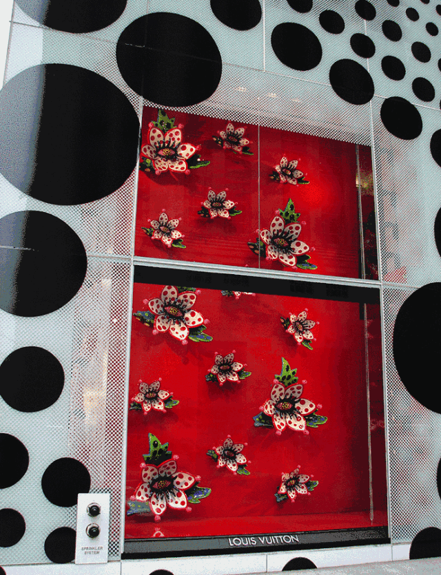 纽约旗舰店建筑位于曼哈顿第五大道和57号街区的东北角白色的墙面包裹在不同尺寸的黑色圆点里,而橱窗展示了草间弥生三个代表性的图案:《Beginning of the Universe》的有机体「神经细胞」雕塑、《Eternal Blooming Flowers in my Mind》的巨型彩色花朵、《Self-Obliteration》的微型草间弥生洋娃娃。