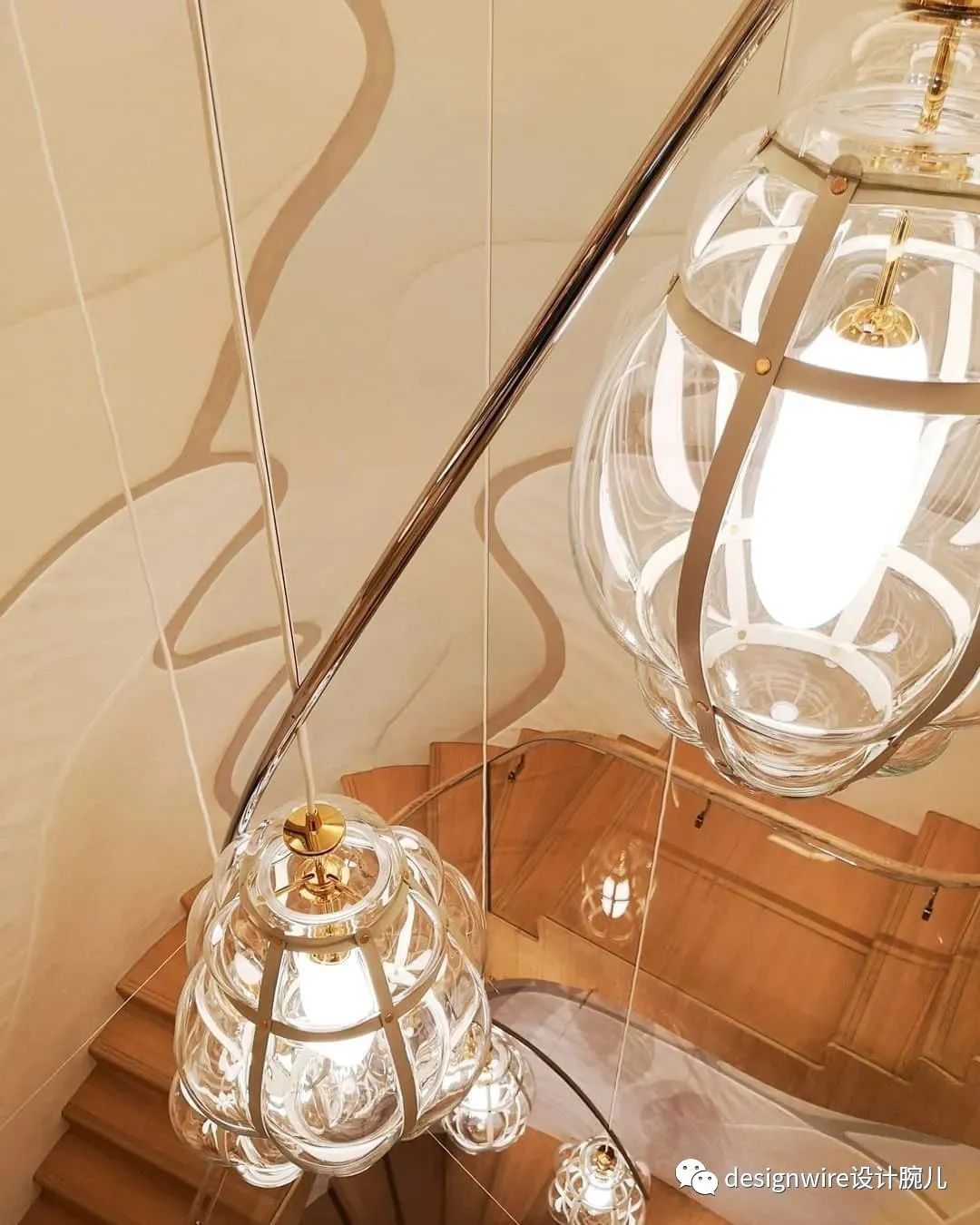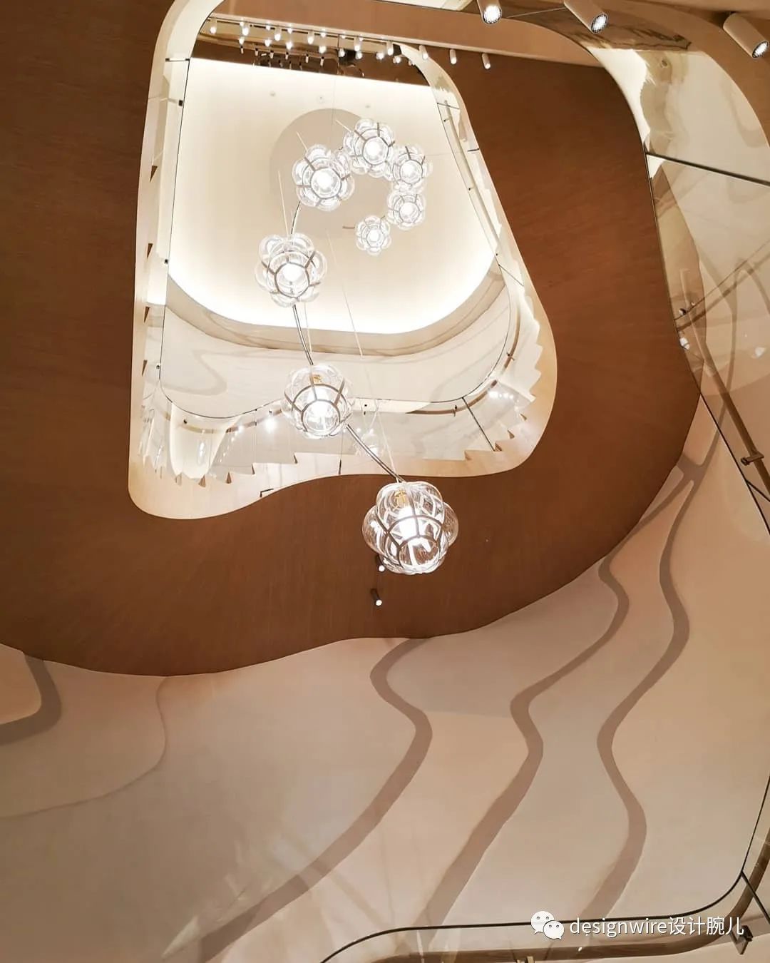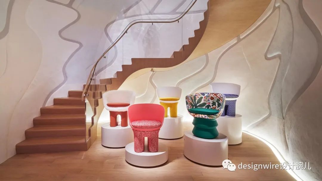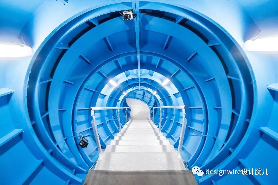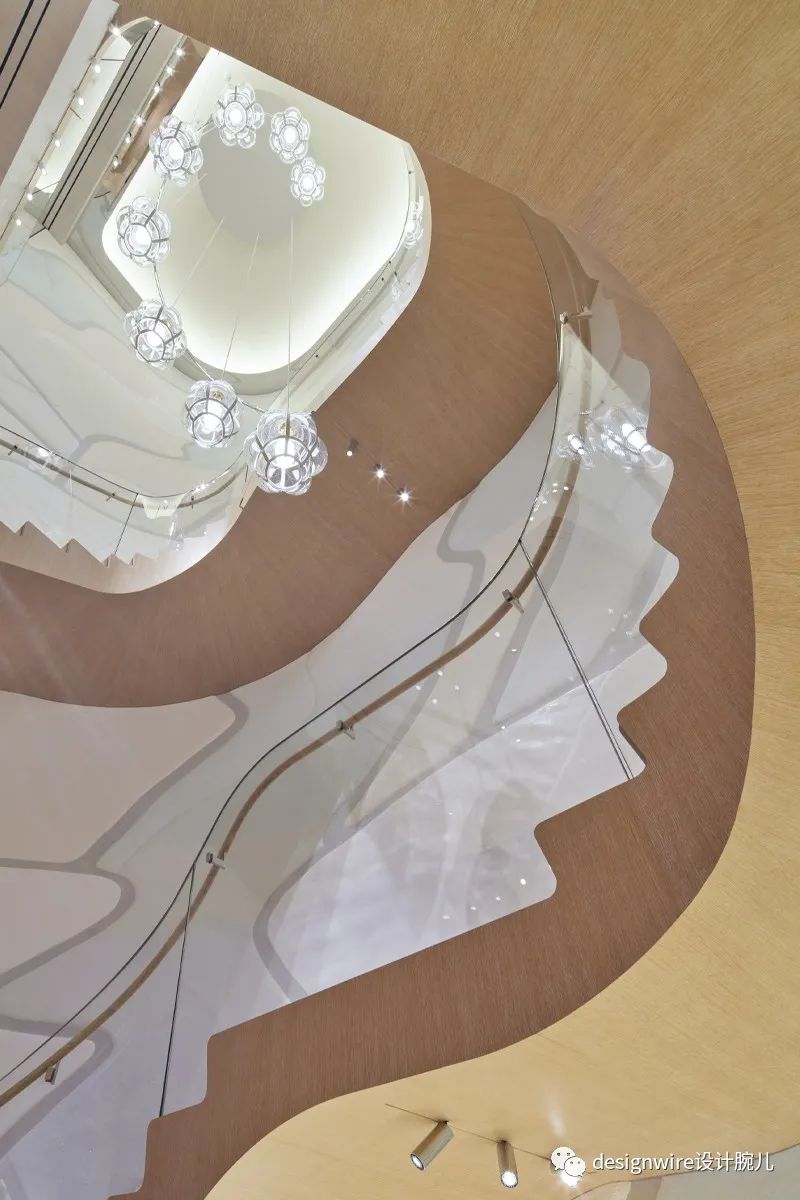 外部的波光粼粼的海洋主题贯穿至内部空间,一楼的螺旋楼梯伴“水母”游曳上升。
