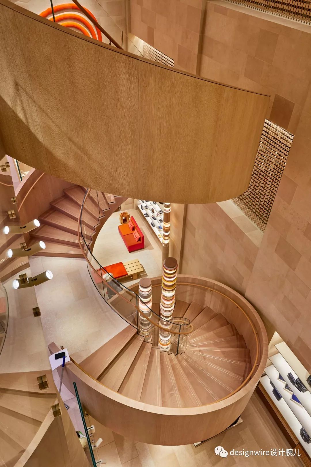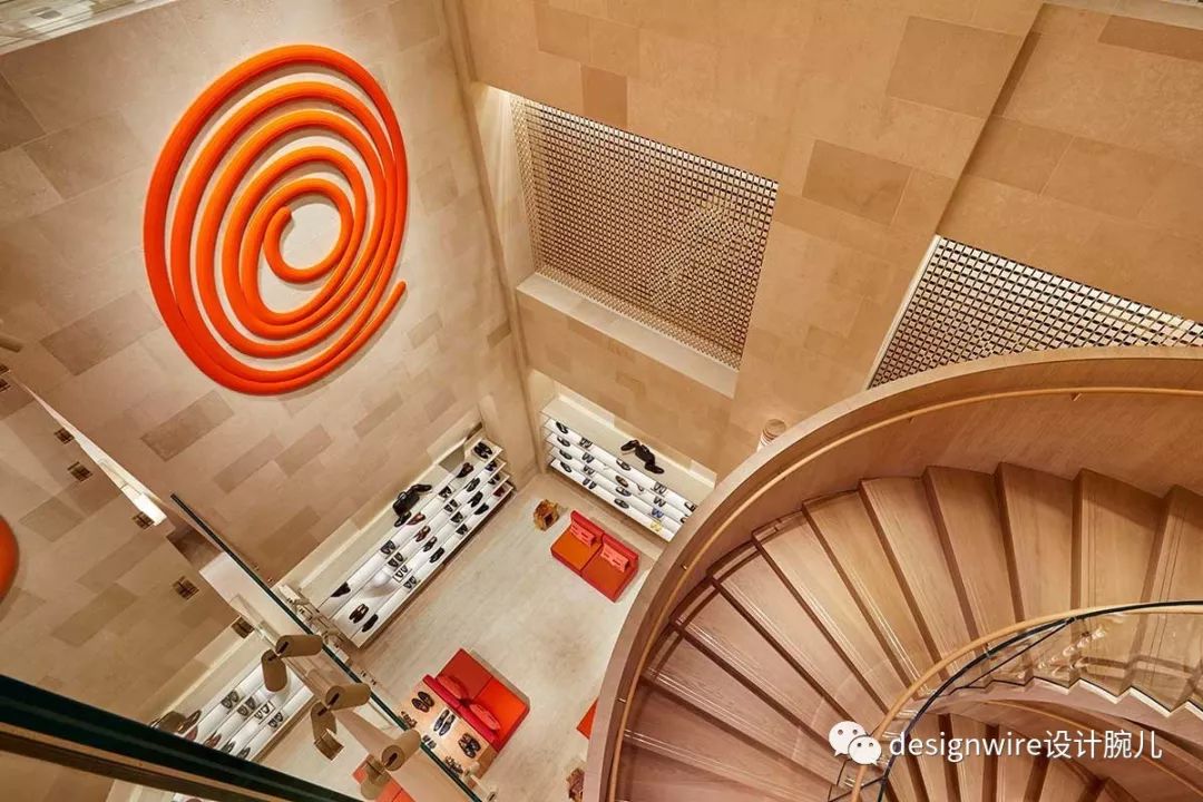 “室内设计考虑到了内心的流动,从弯曲的橡木和在空中招展延伸的的玻璃楼梯,到商店的人流动线中,没有任何视觉的停顿点。” Peter Marino 说。