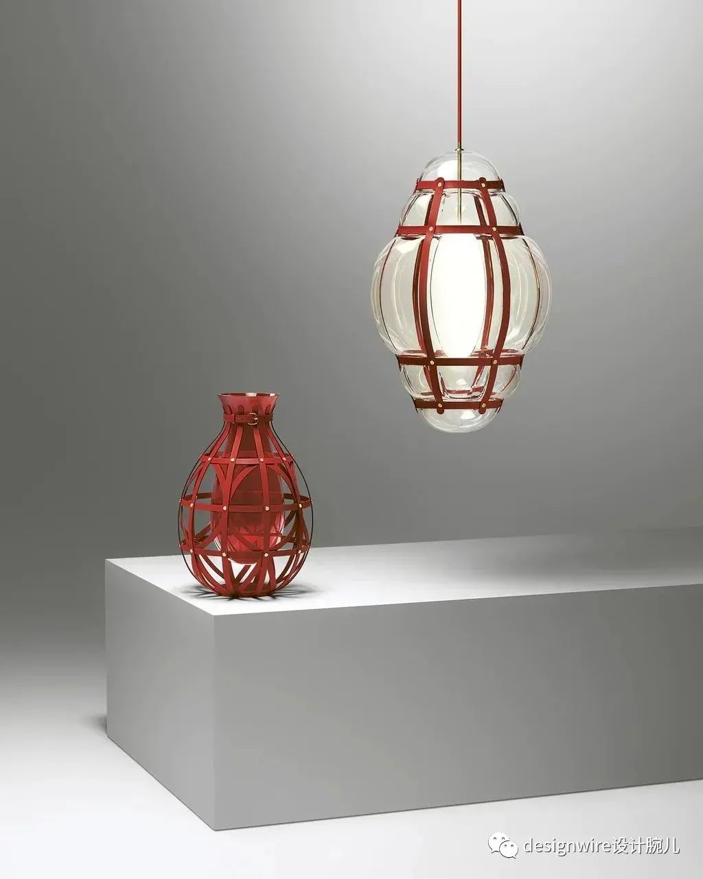 以当代风格重新打造传统威尼斯玻璃灯,置于以金属饰钉固定的皮带网格灯罩内。融入四叶草形状的外型设计,借此向路易威登经典的Monogram图案致敬。