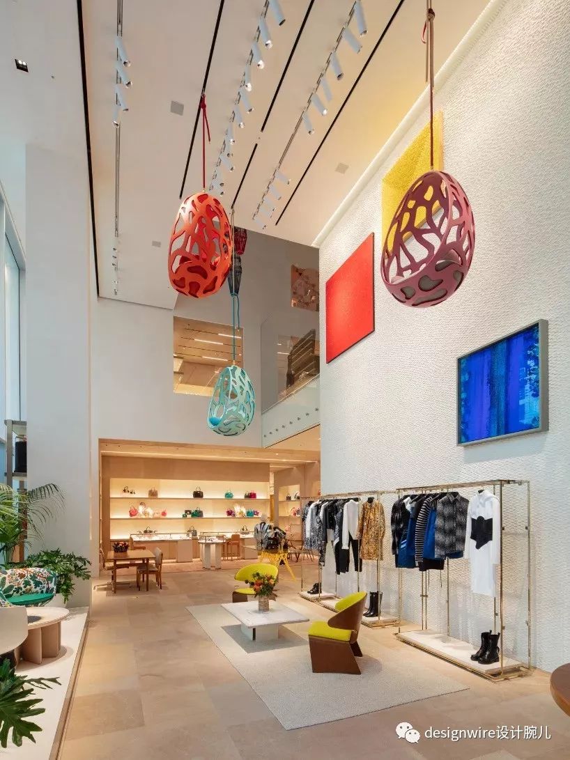 在这幢五层高的建筑内部,Peter Marino设计了许多“零售宇宙”。Marino称:“室内空间采用严谨的密斯式设计,以彰显商店外观的活力感和雕塑感。”立面窗户边还堆簇着由Frank Gehry与商店共同设计的七彩纸雕树丛,其设计灵感来自建筑师用单张纸制作的树木模型。