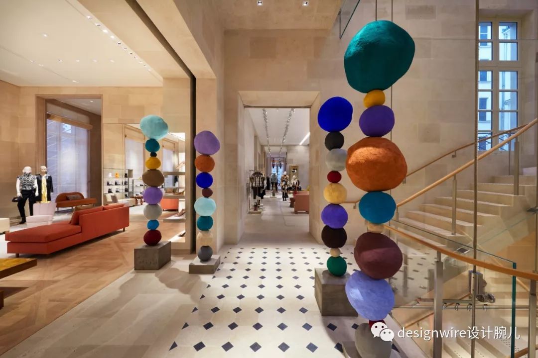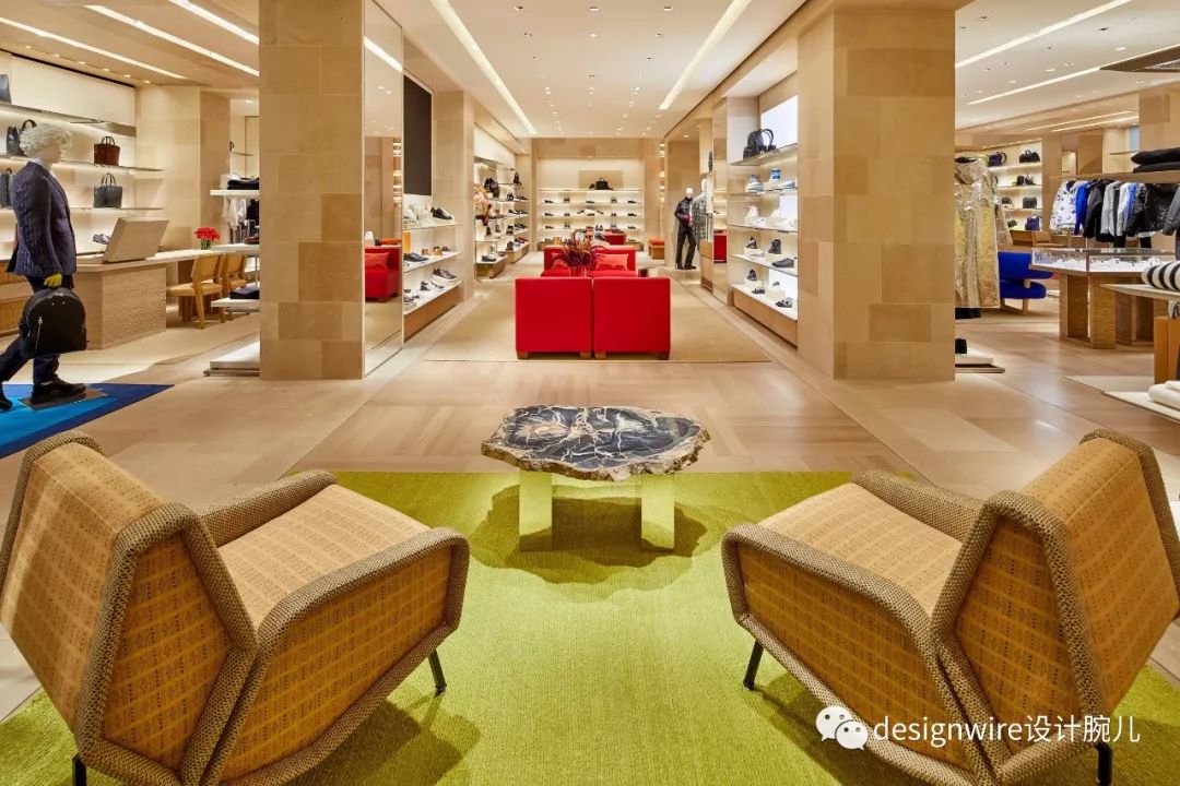 Annie Morris设计的彩色球形雕塑被放置在一堵玻璃墙边。Matt Gagnon设计的LED灯板、有机玻璃及铜盘棋布于楼梯的中央空间内。Andreas Gurksy创作的巨幅版画挂在彩色石墙上。家具制造商Martino Gamper制作的Wom桌子后方是男鞋零售区。Paolo Giordano设计的铜制椅子被置于赭色地毯上。
