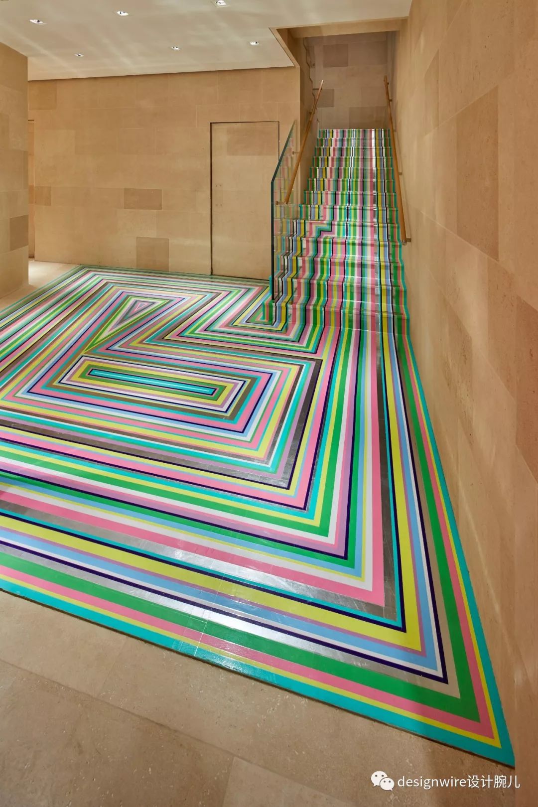 四层高的石膏壁画重新诠释了艺术家Kimiko Fujimura 1977年的画作“ Wave Blue Line” 中的流动感。