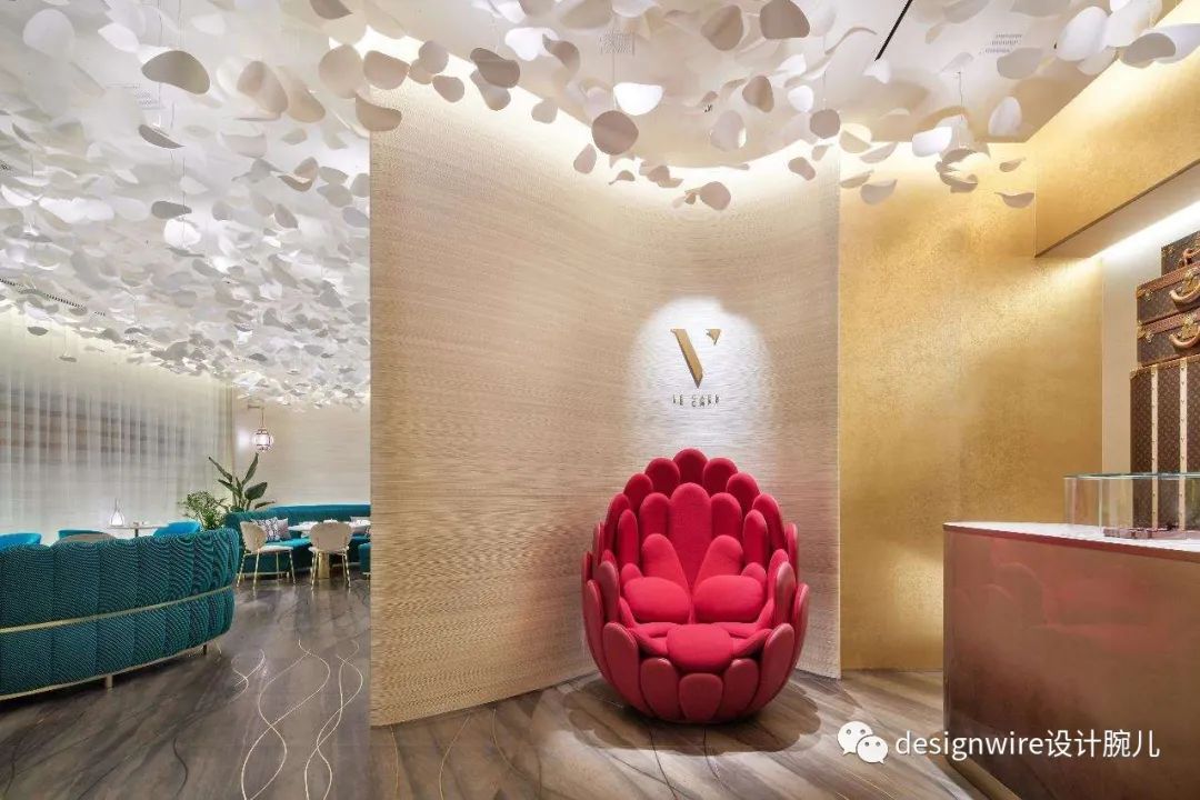 旗舰店最令人瞩目的莫过于位于顶层的Le Café V咖啡厅和Sugalabo V餐厅。咖啡厅设有露台和独特的茧室酒吧。弧形空间以暖色的家具与艺术品点缀与其中,而与之相对的露台则用清凉的色彩呼应室外的好天气。