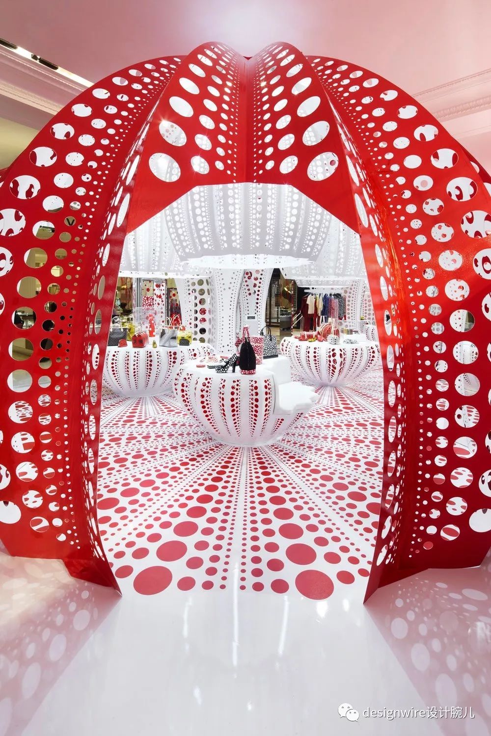 整个概念店充斥着草间弥生标志性的波尔卡圆点:悬挂在展示台上方巨大的穿孔吊灯,而墙面、地面和展示橱窗用不断循环大大小小的亮色圆点覆盖。